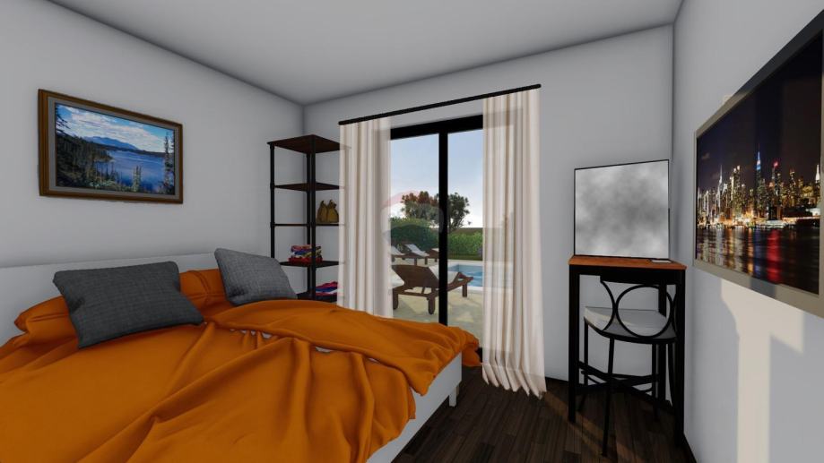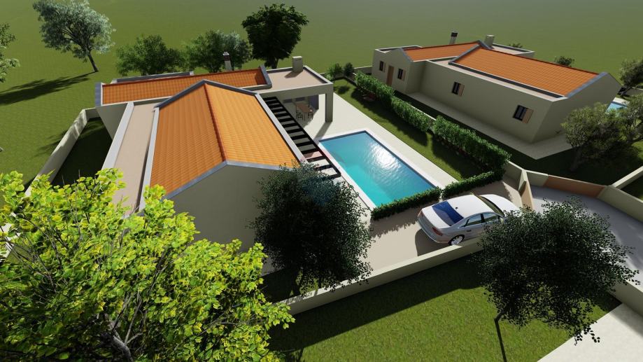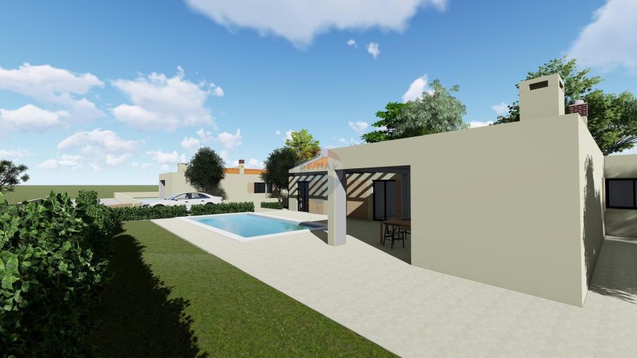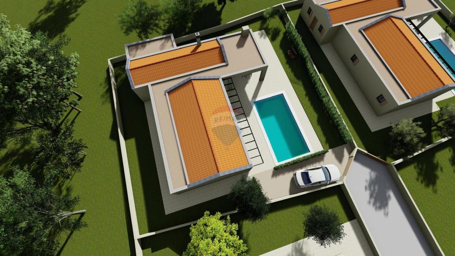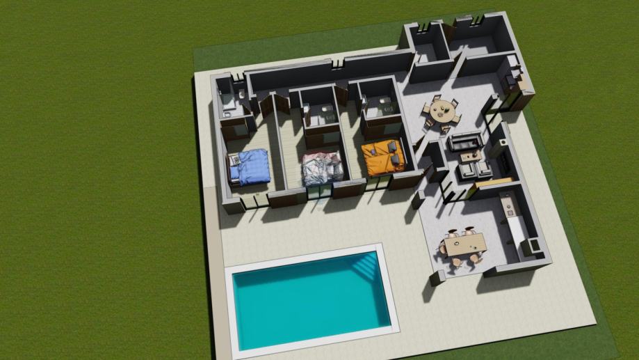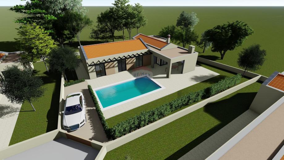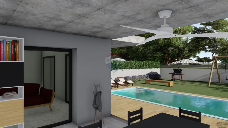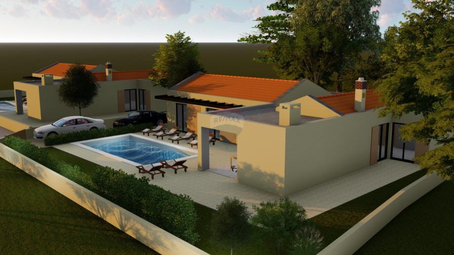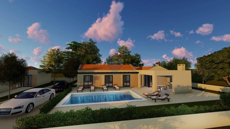 Kuća se sastoji od dnevnog boravka, kuhinje i blagovaone, 3 spavaće sobe sa 3 kupatila i wc-om te natkrivenom terasom. U nastavku se nalzi bazen od 37m2.