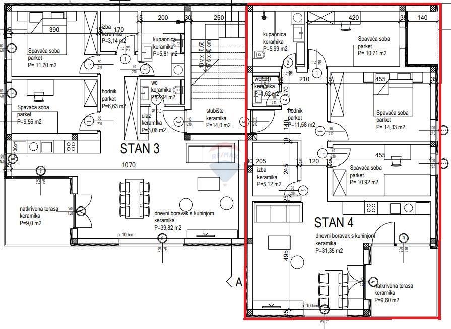 Trosobni je stan lociran na 1. katu, broji ukupno 101,22m2 a sastoji se od: