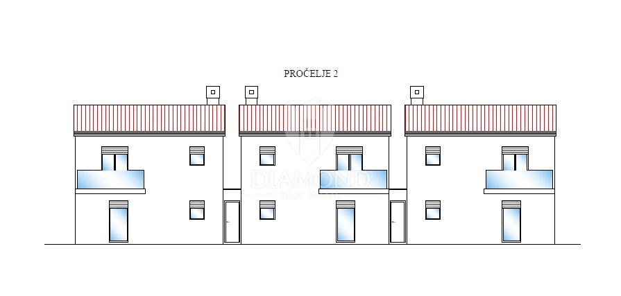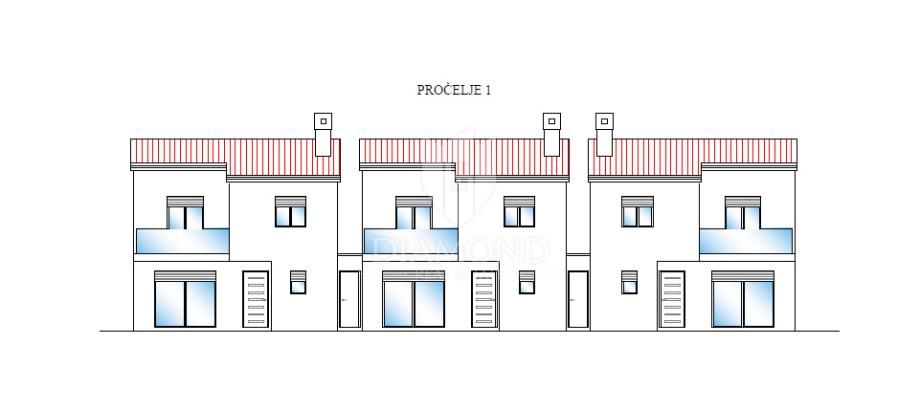 Ukupna površina kuće je netto 101m2 s okućnicom od 250 do 350m2 i vlastitim bazenom od 24m2. Kuća se proteže na dvije etaže te se sastoji od ulazne terase, hodnika, tehničkog prostora, spremišta, kupaonice, dnevnog boravka, kuhinje i blagovaonice s izlazom na vlastitu okućnicu i bazen. Na katu su smještene 3 spavaće sobe od kojih 2 imaju balkon, kupaonica i wc. S balkona će se pružati lijepi pogled prema moru i zelenilu Istre. Stolarija će biti PVC sa roletnama i komarnicima smeđe boje, dok će fasada biti bijele boje uz mediteran crijep čime će se kuća stopiti u prirodan ambijent. Radi se kući koja se nalazi u novom kompleksu od ukupno 24 kuća na 8 zemljišta. Na svakom zemljištu će biti 3 kuće razdvojene spremištem.