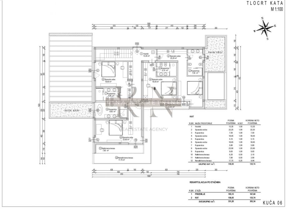 KAT: četiri spavaće sobe sa zasebnim kupaonicama, svaka kupaonica s vlastitim prozorom, i dva izlaza na terasu.