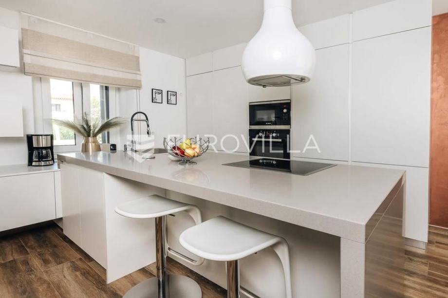 U samom centru Kaštelira nalazi se ova prostrana kuća za najam, raspoređena na tri etaže.PrizemljeOpen space dnevni boravakModerna kuhinja s otokom i blagovaonicomIzlaz na veliku natkrivenu terasuGostinjski WCVešerajPrvi katTri spavaće sobe, od kojih:Jedna ima izlaz na terasu s panoramskim...