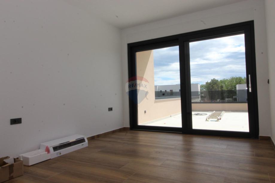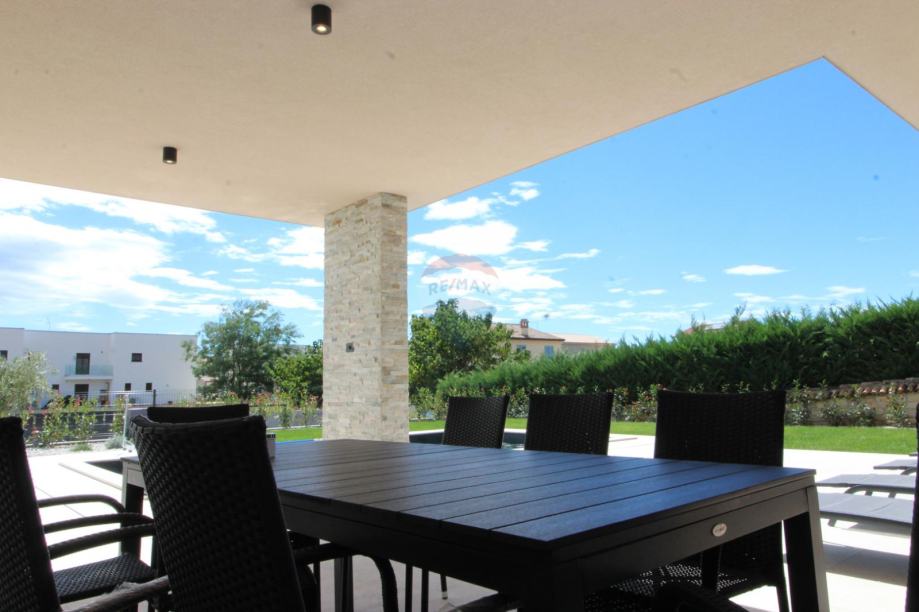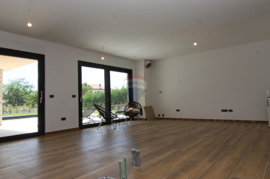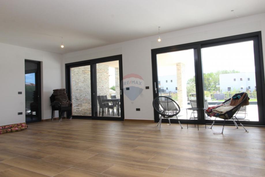 Kuća je izrađena u modernom stilu otvorenog koncepta, u prizemlju se nalazi dnevni boravak s kuhinjom i blagovaonom, jedna spavaća soba s kupaonom, prostor predviđen za saunu ili fitness room. izdnevnog boravka izlazi se na terasu i bazen.