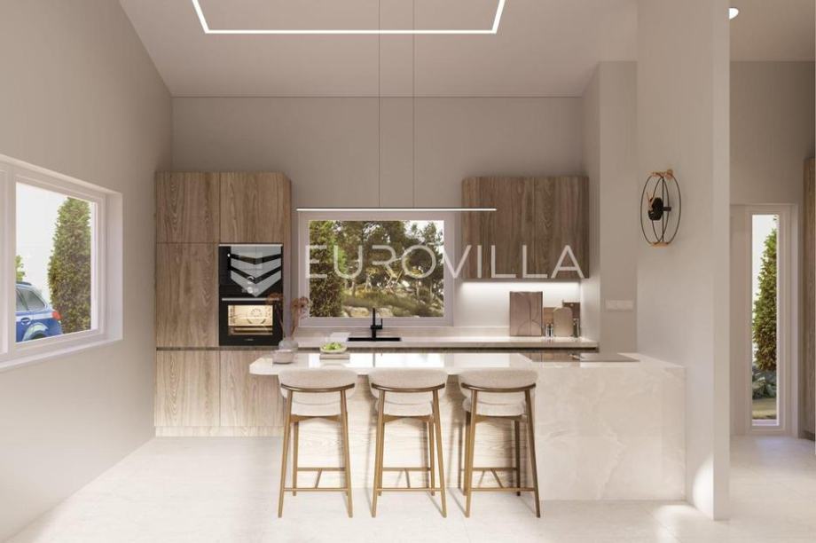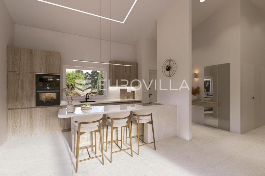 U mirnom, zelenilom okruženom predjelu Kaštelira smjestila se Jedinica C - moderna prizemnica površine 92,5 m2, čiji pažljivo osmišljeni raspored i dodatni sadržaji pružaju visoku razinu komfora i privatnosti. Posebnu vrijednost ovoj nekretnini daje vlastiti bazen od 30,6 m2, koji je uključen u cijenu.Interijer karakterizira prozračan dnevni prostor otvorenog tipa, povezan s kuhinjom i blagovaonicom, obasjan prirodnim svjetlom i naglašen visokim stropovima od 4 metra s vidljivo ostavljenim drvenim gredama. Tri funkcionalne i udobne sobe, kupaonica, dodatni WC te spremište omogućuju organiziran i udoban svakodnevni život. Keramičke podne obloge u cijelom prostoru dodatno naglašavaju suvremeni i praktični karakter kuće.Jedinica C građena je od Wienerberger Porotherm cigle, opremljena je Kommerling stolarijom, a integriran je i dimnjak za kamin - sve u skladu s visokim građevinskim standardima i dugotrajnom kvalitetom. Ugrađena je predinstalacija za solarne panele i predinstalacija za punjač električnog automobila, dok je grijanje riješeno putem niskoenergetskog podnog grijanja. Dodatne dvije klime osiguravaju ugodnu temperaturu tijekom cijele godine.U privatnom dvorištu nalazi se elegantan bazen, idealan za ljetno opuštanje i druženje, a njegov završetak uključen je u cijenu. Dva privatna parkirna mjesta također su osigurana, kao i natkriveni vanjski prostor koji poziva na uživanje u tišini i prirodi.Nekretnina je trenutno u fazi visokog rohbau-a, s planiranim useljenjem do kraja listopada 2025. godine.Jedinica C je savršen izbor za one koji traže više - više komfora, više privatnosti i više vrijednosti, bilo za život, odmor ili investiciju.Sav sadržaj za život nalazi se u blizini!Za više informacija stojim Vam na raspolaganju!...