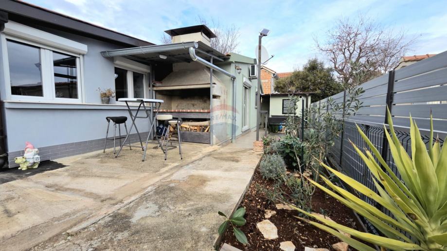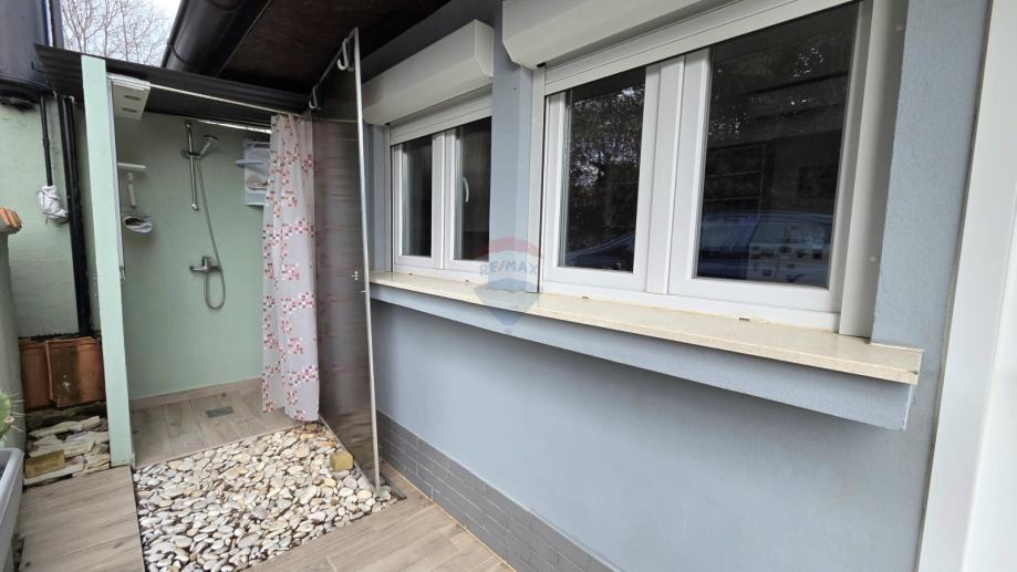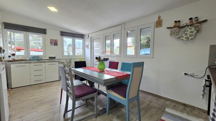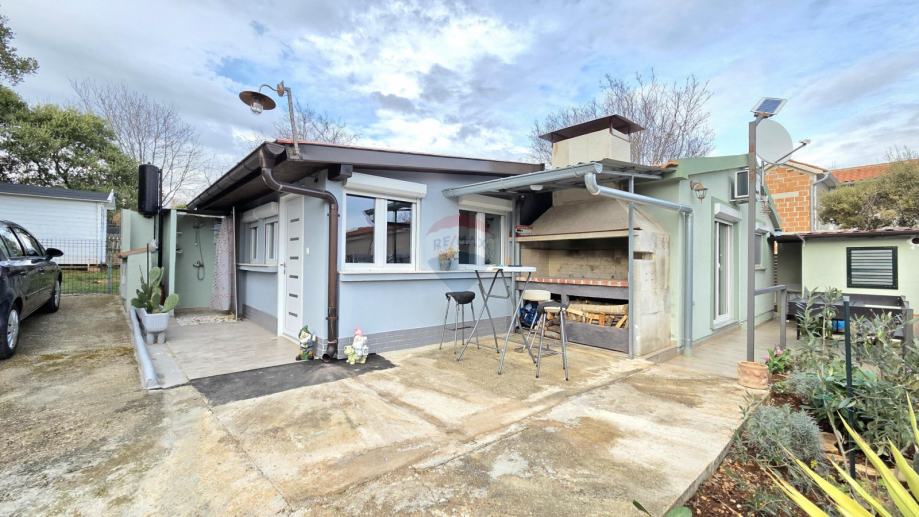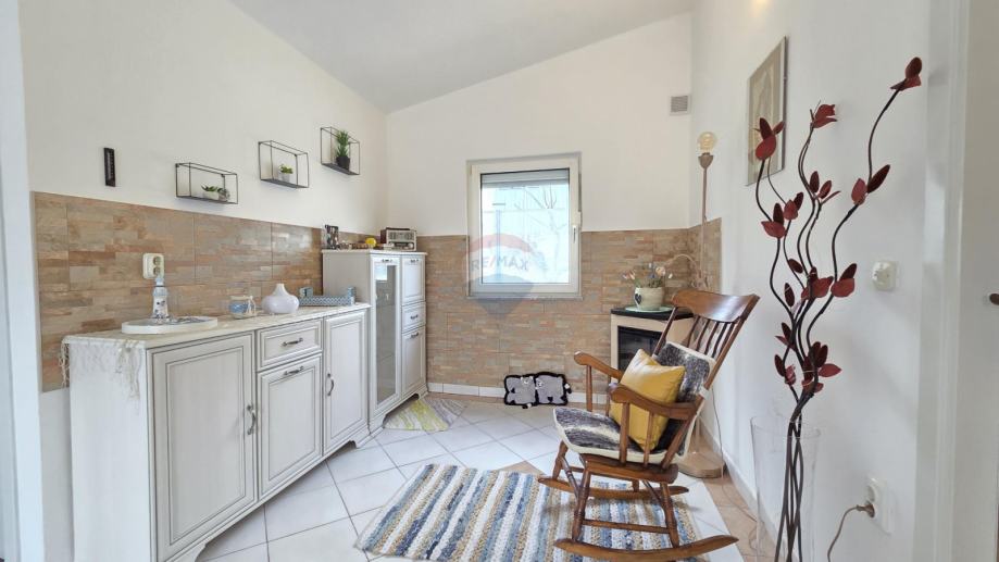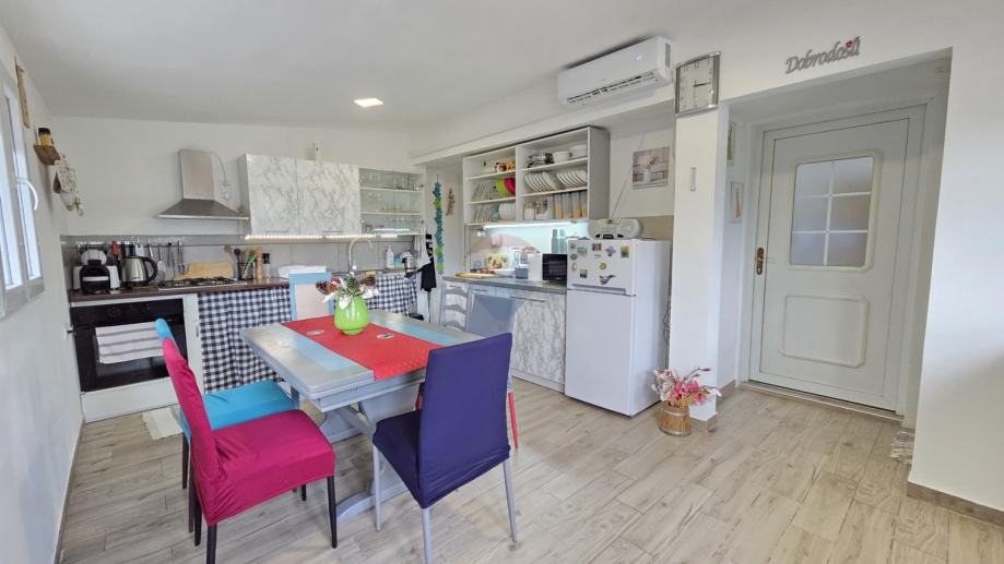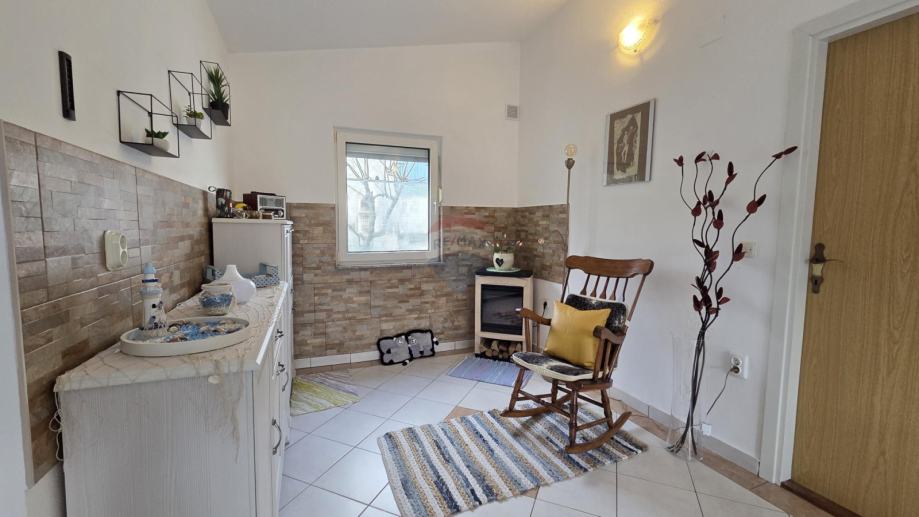 Kuća je površine 74 m² i sastoji se od dvije spavaće sobe, dnevnog boravka, hodnika, te prostrane kuhinje s blagovaonom i terasom. Na terasi se nalazi veliki kamin, idealan za uživanje u vanjskim trenucima. Tu je i dodatno spremište koje služi kao alatnica. Okućnica je lijepo uređena te ima i vanjski tuš.