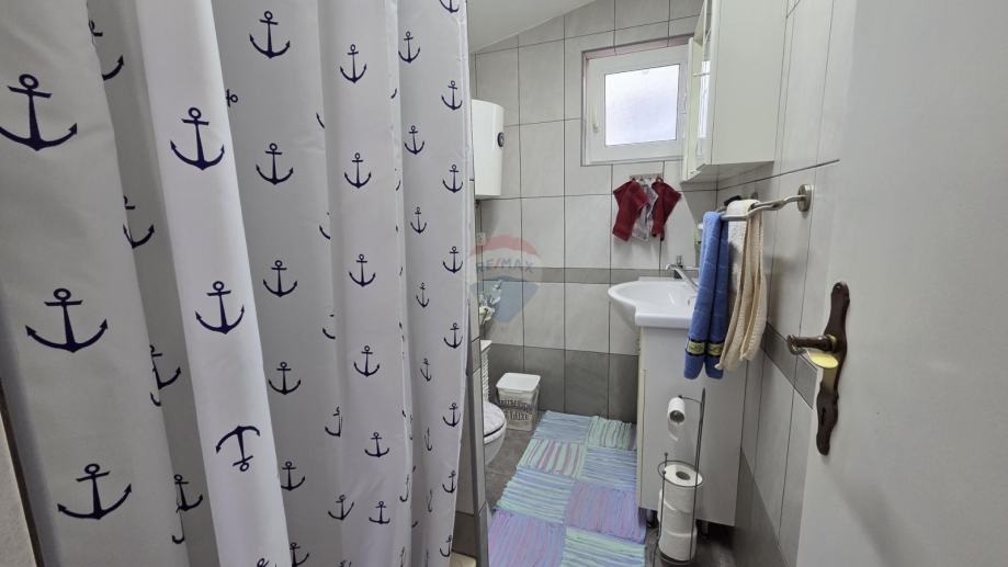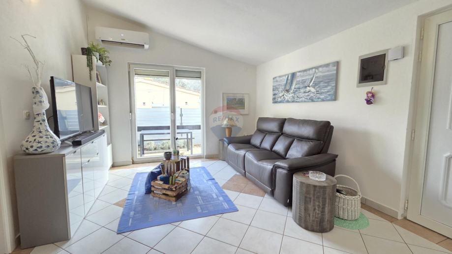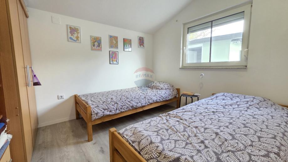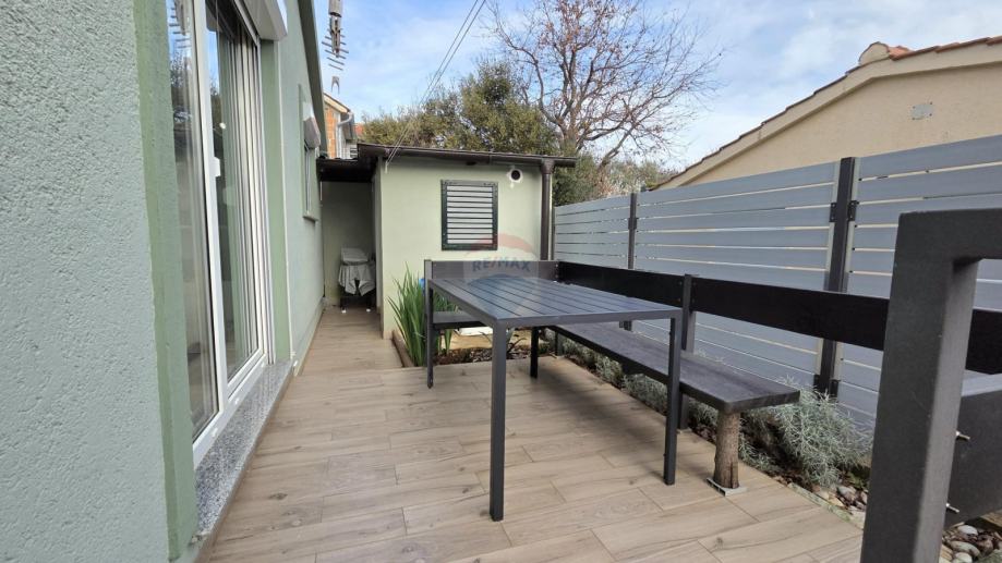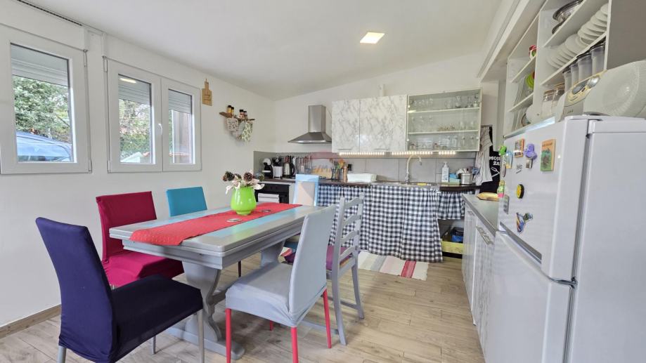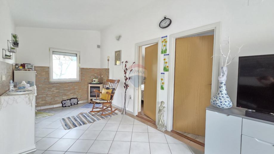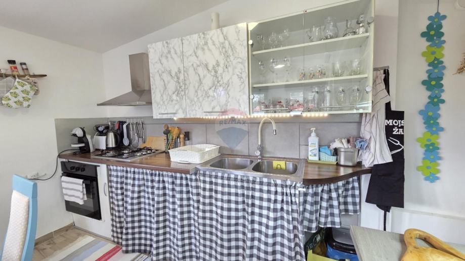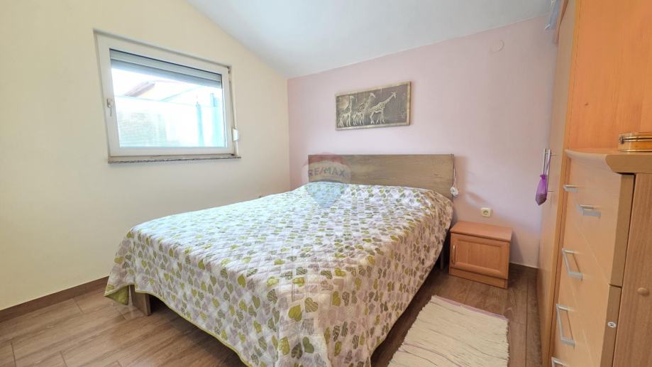 Kuća je površine 74 m² i sastoji se od dvije spavaće sobe, dnevnog boravka, hodnika, te prostrane kuhinje s blagovaonom i terasom. Na terasi se nalazi veliki kamin, idealan za uživanje u vanjskim trenucima. Tu je i dodatno spremište koje služi kao alatnica. Okućnica je lijepo uređena te ima i vanjski tuš.