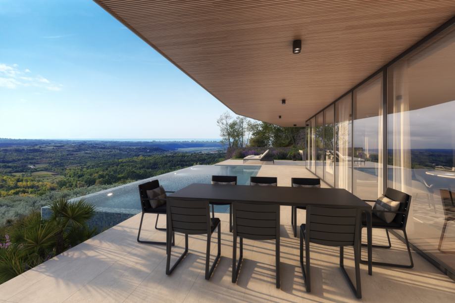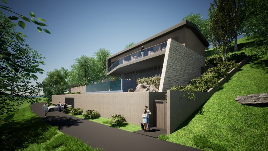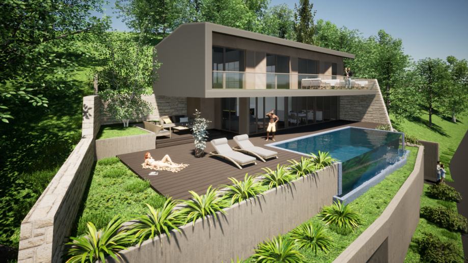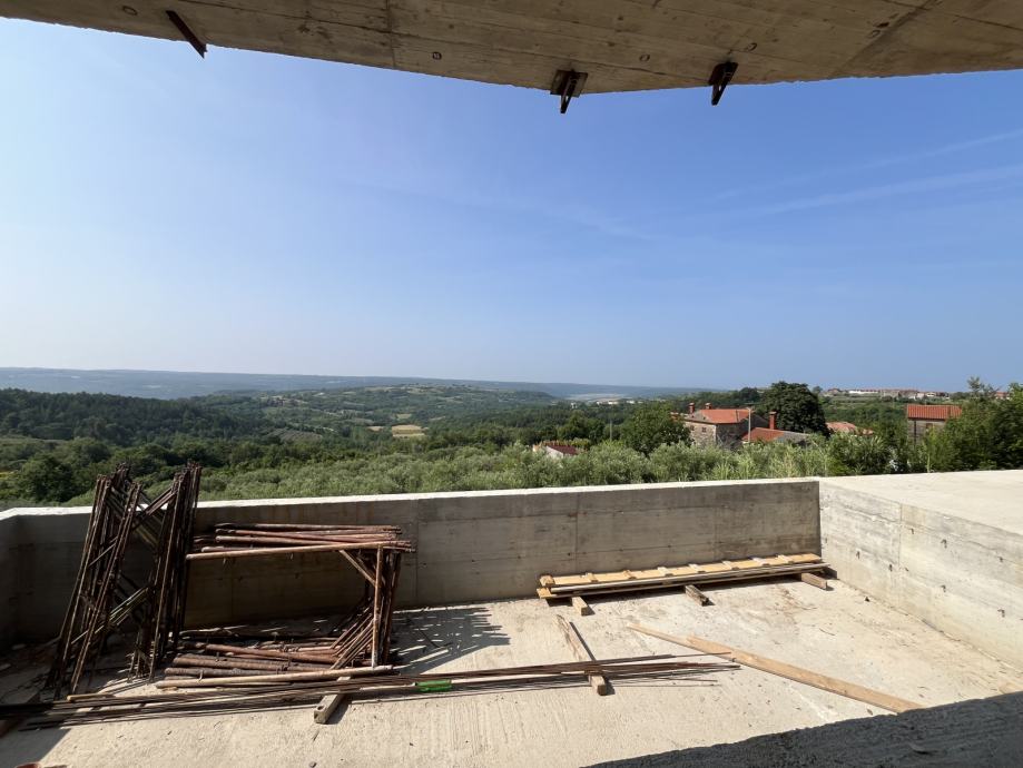Nekoliko minuta vožnje od grada Buja , okružena zelenilom i prirodom smještena u mirnoj ulici nalazi se moderna samostojeća kuća s bazenom sa koje se proteže predivan pogledom na more. Kuća je ukupne neto površine 430 m2 , sa terasom od 149 m2 i bazena 35 m2 a proteže se na tri etaže.
