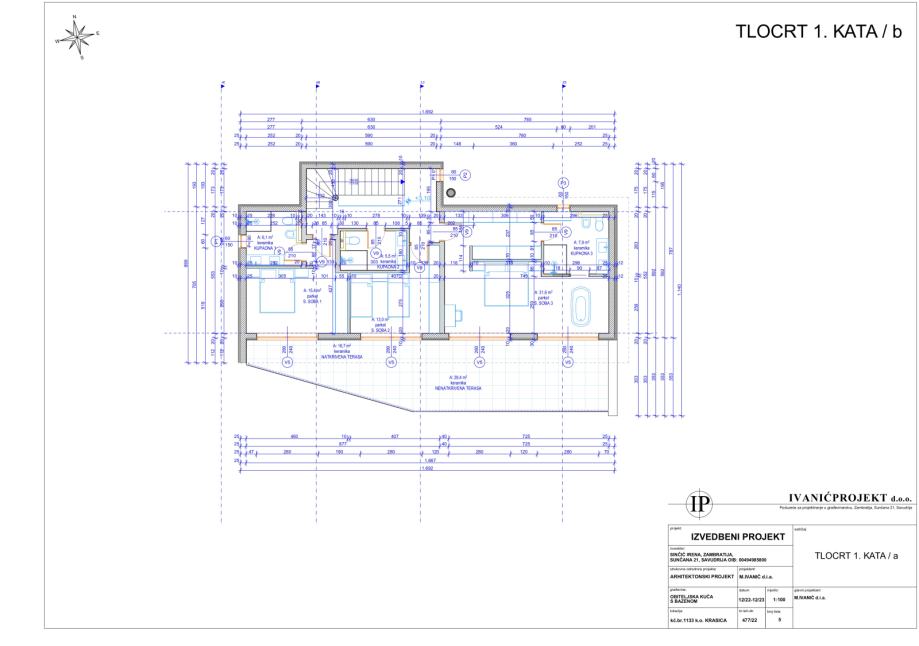 Na katu se nalaze 3 prostrane spavaće sobe koje su povezane terasom .