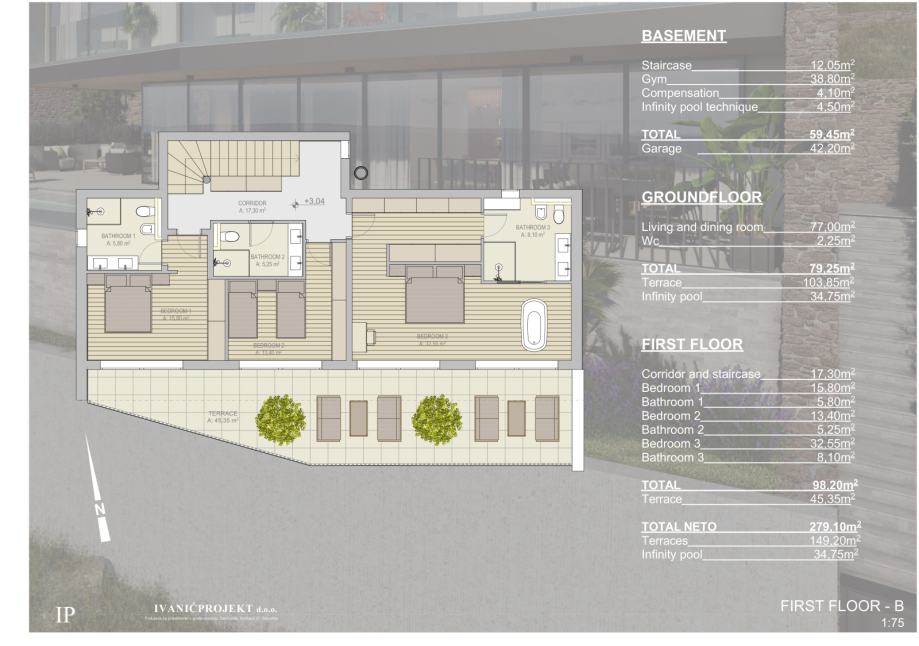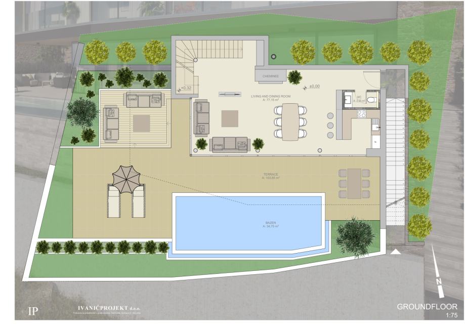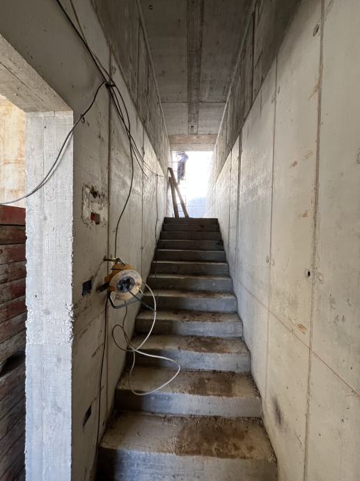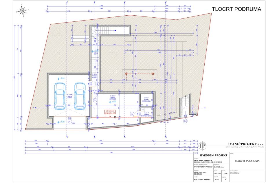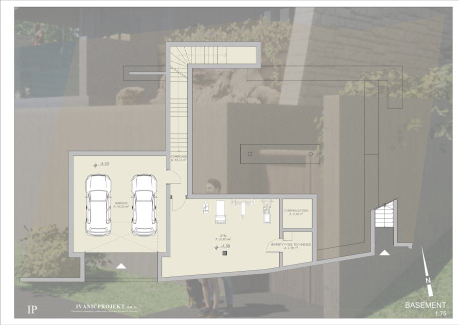 U podrumu se nalaze garaža za 2 vozila , prostorija u kojoj možete smjestiti saunu ,teretanu ili konobu, kotlovnica i prostorija za bazensku tehniku.Unutarnjim stepenicama su povezane sve tri etaže tako da iz garaže idete u prizemni dio gdje se nalazi veliki dnevni boravak sa kuhinjom i blagovaonicom otvorenog tipa i wc-a.