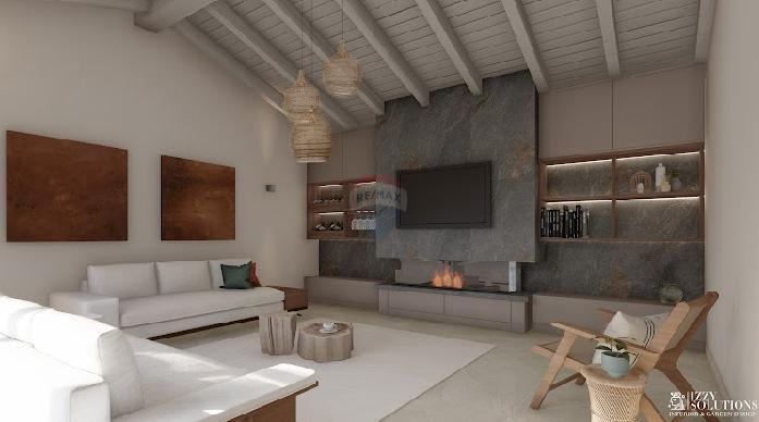 U prizemlju je veliki dnevni boravak sa kaminom, kuhinja, blagavaonica, jedna spavaća soba, kupaonica, tehnička prostorija, jedna velika i jedna manja terasa.