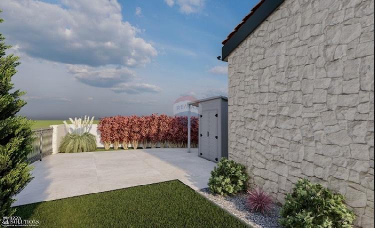 Vanjski dio na parceli od 660m2 sastoji se od grijanog bazena 37m2, ljetne kuhinje, roštilja, tuša, WC-a, saune i ognjišta, odnosno prostora za druženje. Sklad vanjskog prostora upotpunjuje mediteransko drveće i bilje te navodnjavan i održavan travnjak.