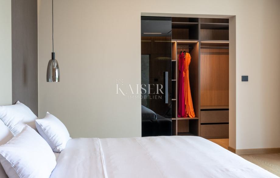 Na katu vile nalaze se tri prostrane spavaće sobe, svaka s vlastitom en suite kupaonicom i garderobom, te izlazom na natkrivenu terasu s koje se pruža predivan pogled na more i otoke. Unutrašnjost vile uređena je u modernom stilu, s naglaskom na prostranost, svjetlost i vrhunsku kvalitetu materijala.