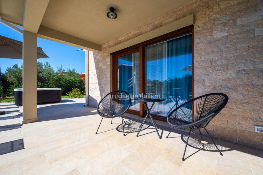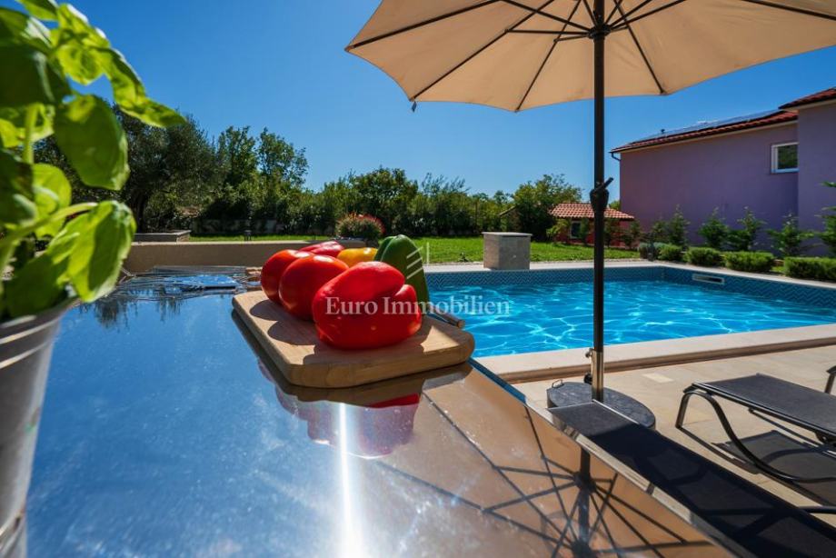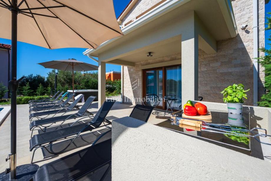U dvorištu se nalazi bazen od 32 m², jacuzzi, vanjski tuš te zona s roštiljem. Parcela od 780 m² je potpuno ograđena.