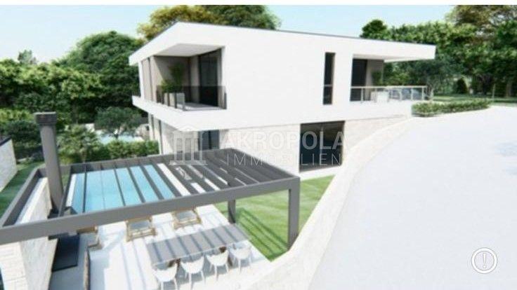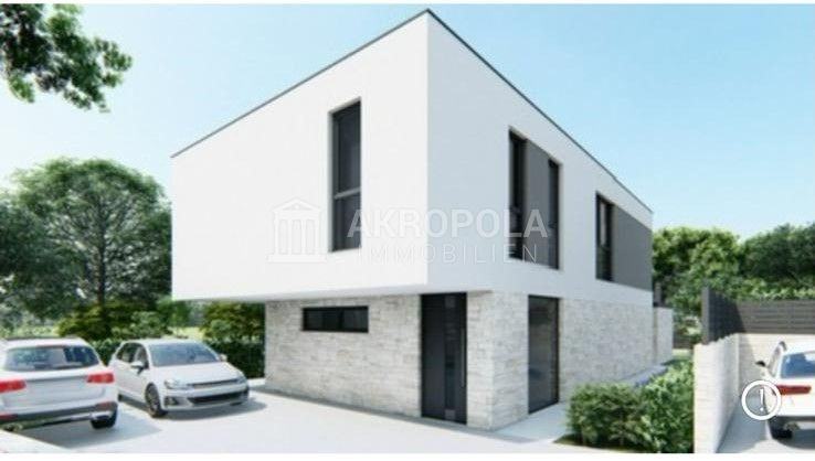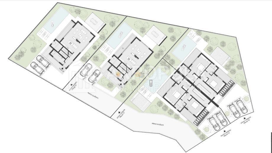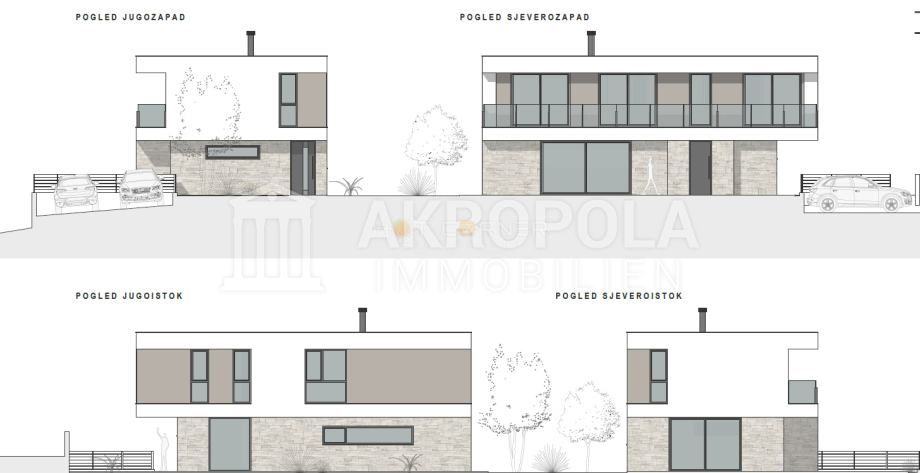 Vilu se sastoji od dvije etaže ( prizemlje plus kat ) s pripadajućim dijelom okućnice gdje je predviđen bazen, s prednje strane su predviđena dva parkirna mjesta.