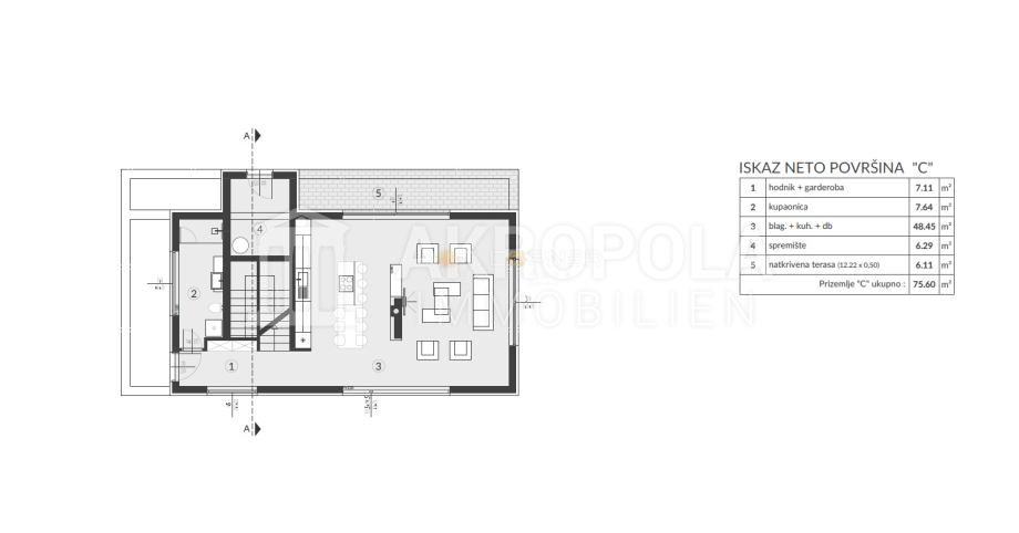 U prizemlju je predviđen: hodnik+ garderoba, kupaonica, blagovaonica s kuhinjom i dnevnim boravkom, spremište i natkrivena terasa; površine 75,60 m2.