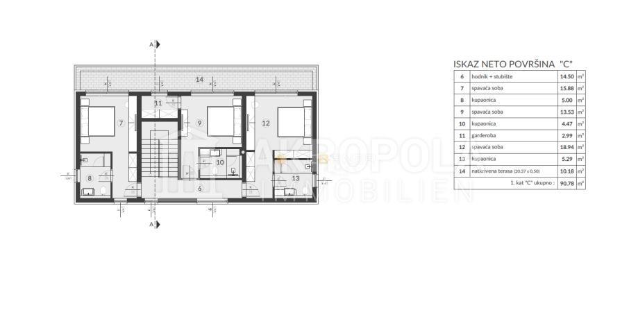 Unutarnje stepenište vodi na kat gdje je predviđen hodnik, tri spavaće sobe s kupaonicama (jedna ima i garderobu) s izlazom na veliku natkrivenu terasu. Površina ove etaže iznosi 90,78 m2.