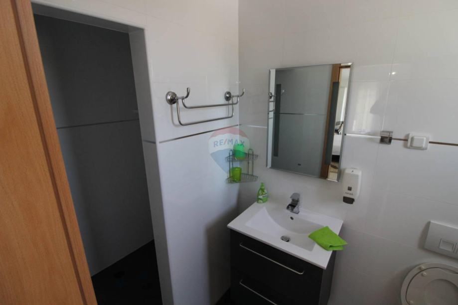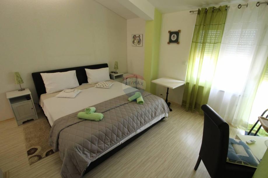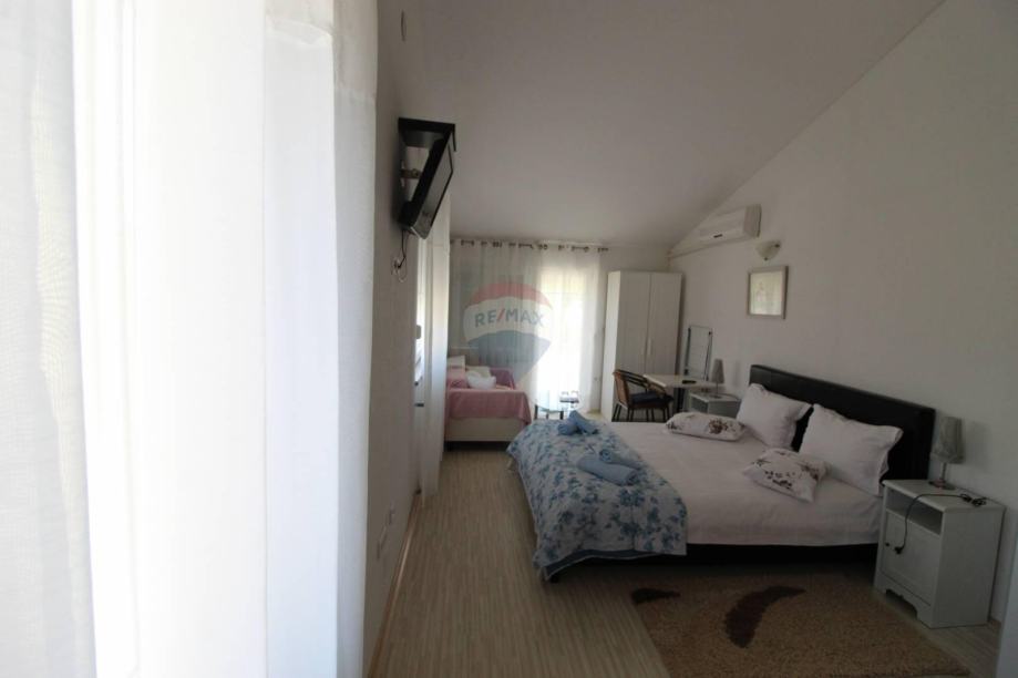 U drugoj zgradi u prizemlju se nalazi poslovni prostor od 100 m2, za ugostiteljstvo sa opremom, sanitarnim čvorem i uređenom terasom sa vanjskim objektom za pripremu hrane. Iznad poslovnog prostora su još 3 manja studio apartmana sa kupatilima i balkonima. U pomoćnom objektu od 30 m2 su također 2 spavaće sobe, kuhinja i kupatilo te spremište. Na okućnici od 683 m2 se nalazi i vanjski kamin sa uređenim i natkrivenim prostorom za objedovanje "al fresco". Velikim dijelom okućnica je uređena kombinacijom pločica, kamena, travnjaka te prekrasnim grmljem i raznim ukrasnim biljkama. Cjelokupno, jako dobro osmišljena, napravljena i uređena nekretnina koja može biti i mini hotel te investicija sa povratom sredstava na duži rok.