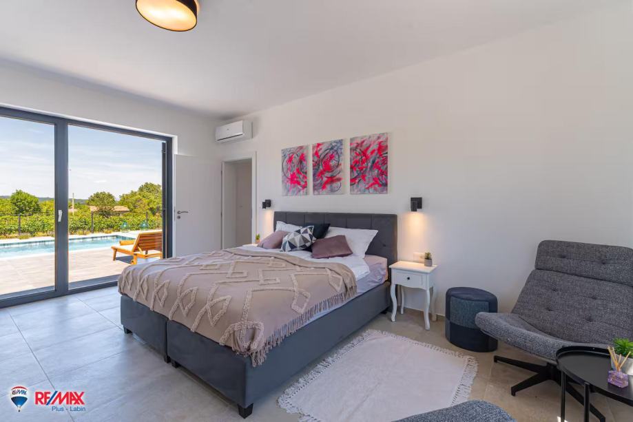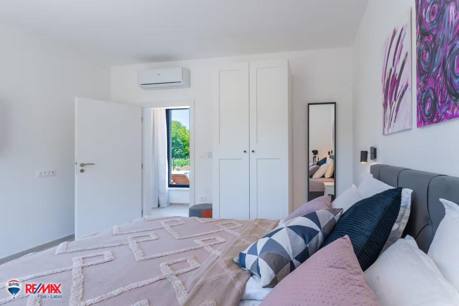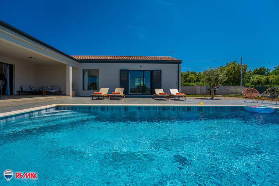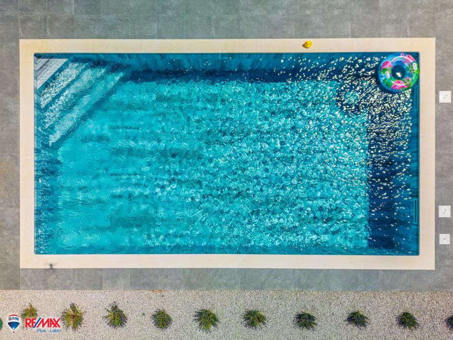 Na prodaju je moderno uređena prizemnica izgrađena 2023. godine, smještena na mirnoj lokaciji okruženoj prirodom, s predivnim pogledom na šumu i planinu Učku. Kuća ima 150 m² korisne površine i nalazi se na prostranoj, potpuno uređenoj okućnici od 845 m², koja pruža visoku razinu privatnosti i ugodnog boravka na otvorenom.