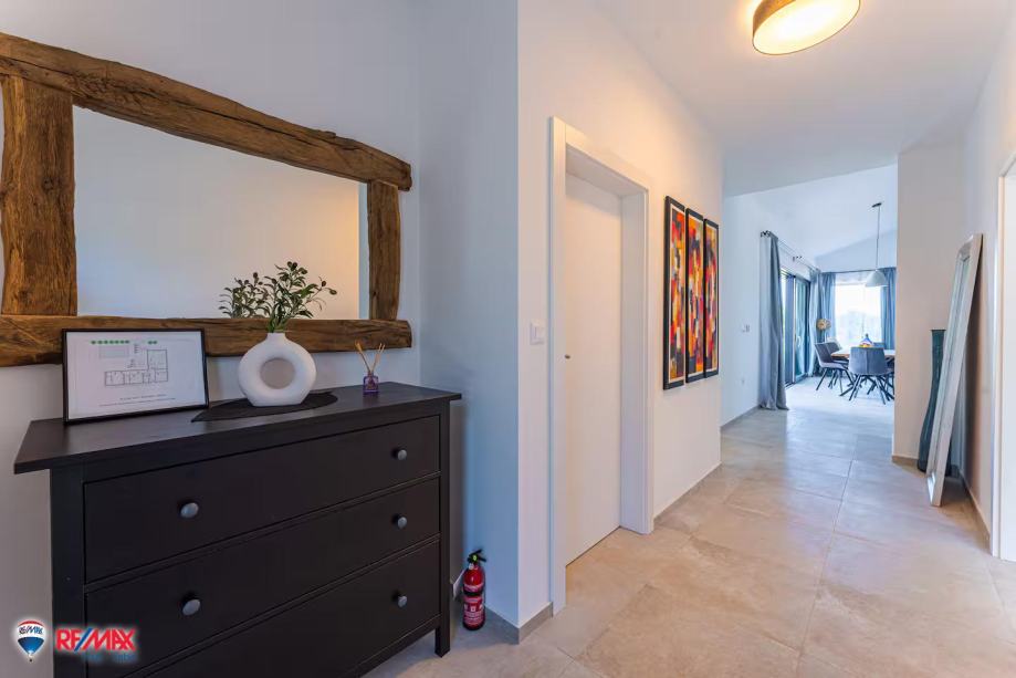 Unutrašnjost je pažljivo osmišljena kako bi pružila maksimalnu udobnost i funkcionalnost. Sastoji se od tri spavaće sobe, tri moderno opremljene kupaonice, dodatnog toaleta, te prostranog dnevnog prostora koji objedinjuje kuhinju, blagovaonicu i dnevni boravak s kaminom. Ostava i tehnička soba dodatno olakšavaju svakodnevni život. Cijela kuća opremljena je podnim grijanjem, a klimatizirana je kako bi pružila ugodnu temperaturu tijekom cijele godine.
