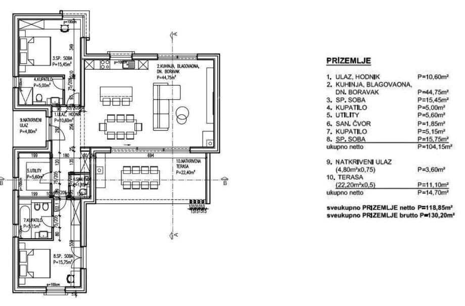 Dnevni dio se sastoji od kuhinje, blagovaonice i dnevnog boravka s izlazom na natkrivenu terasu koja sadrži ljetnu kuhinju dok se noćni dio sastoji od dvije spavaće sobe s vlastitim kupaonicama. Tlocrt nadopunjuju hodnik, gostinjski toalet i spremište.