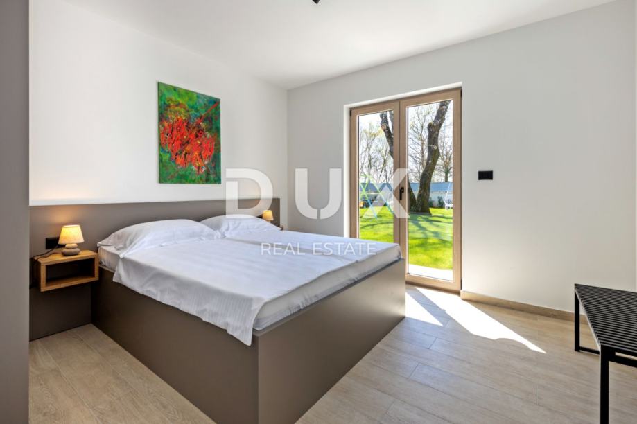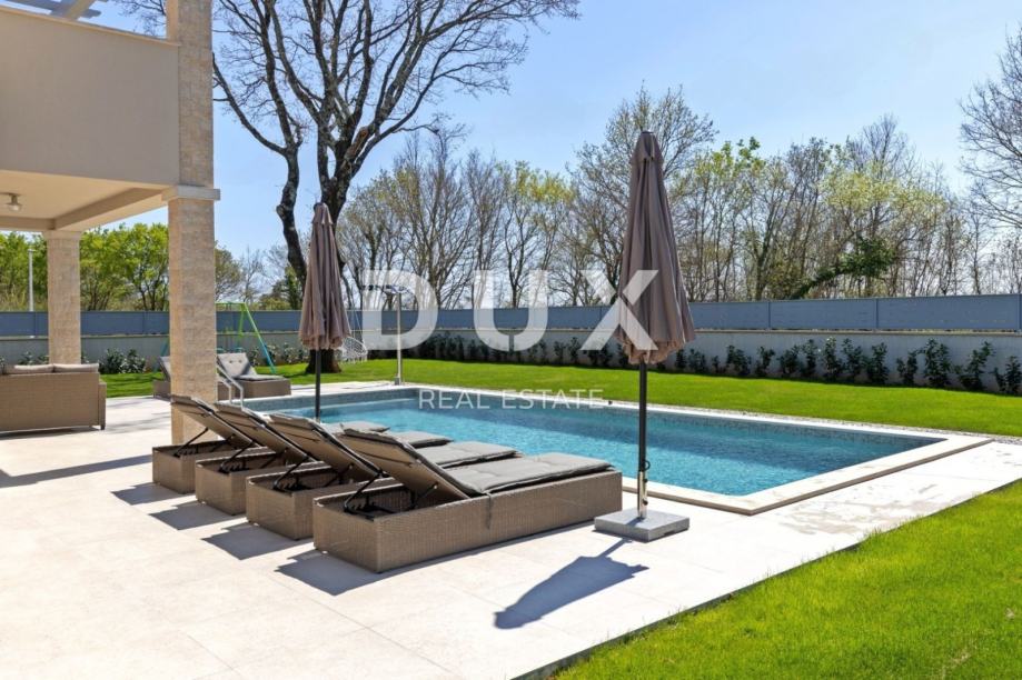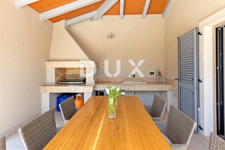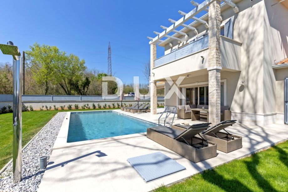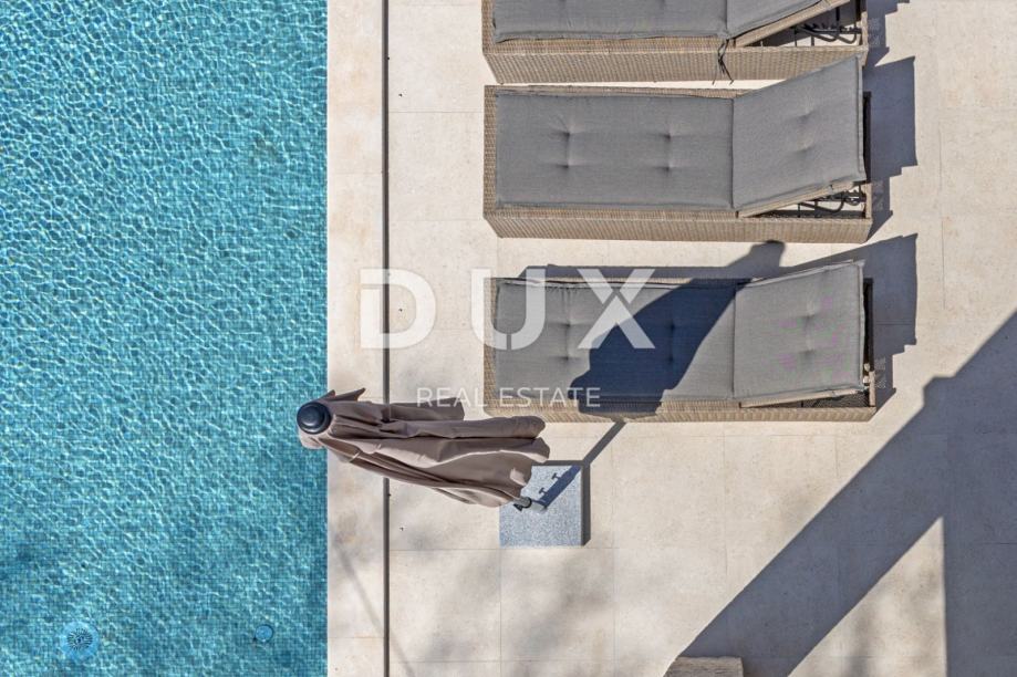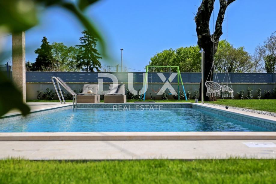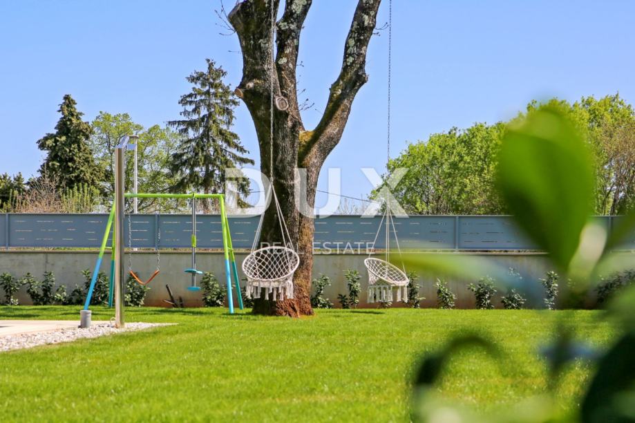 Okućnica je ambijentalno i hortikulturno uređena a potpuni sklad pruža elegantno ukomponiran bazen površine 40 m² sa sunčalištem.