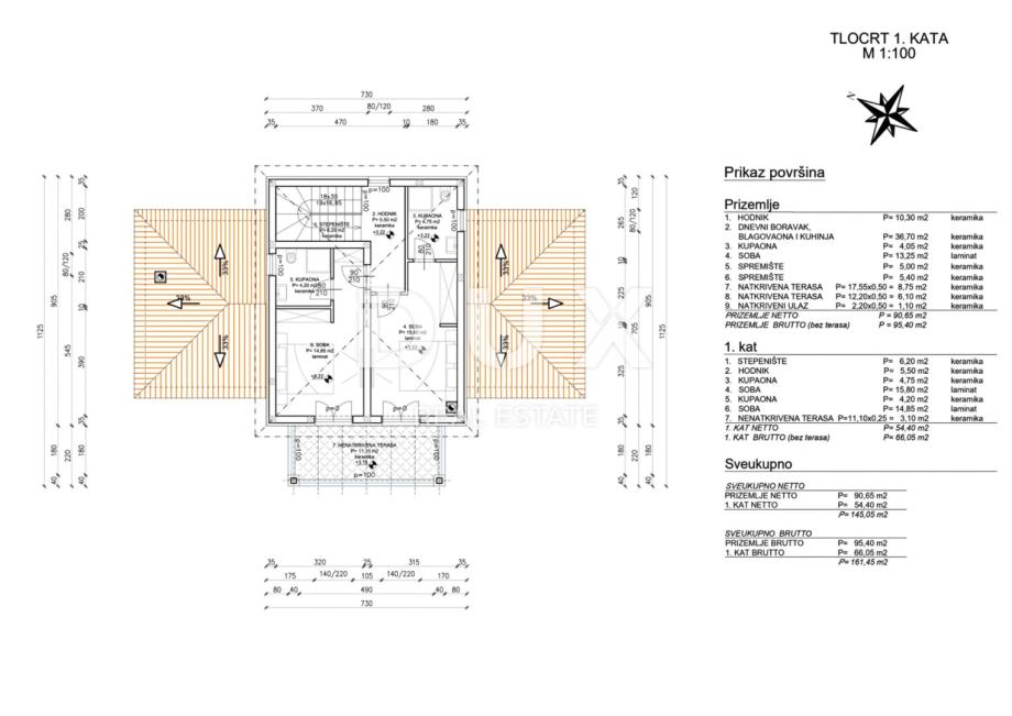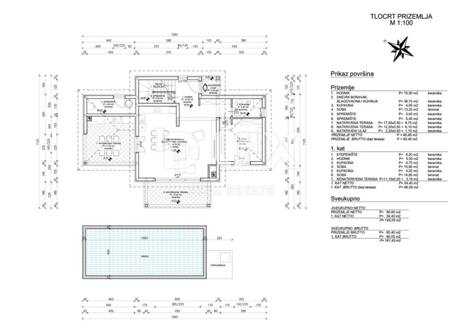 Prizemlje se sastoji od otvorenog koncepta prostora koji ujedinjuje dnevni boravak, blagovaonicu i kuhinju s izlazom na natkrivenu terasu koja sadrži ljetnu kuhinju. Tlocrt prizemlja nadopunjuju spavaća soba, kupaonica i prostorija za tehniku/ spremište. Kat se sastoji od dvije spavaće sobe s vlastitim kupaonicama i izlazima na terasu natkrivenu pergolom.