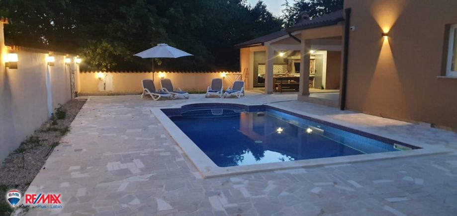 Na samo 5 minuta vožnje od Labina prodaje se moderno uređena katnica s bazenom, prostranom okućnicom i potpunom privatnošću, idealna za obiteljski život ili turističku investiciju. Kuća ima površinu od 151 m², a nalazi se na ograđenom i održavanom zemljištu veličine 845 m². Sastoji se od četiri spavaće sobe, dvije kupaonice te jednog vanjskog toaleta, a izgrađena je 2017. godine.