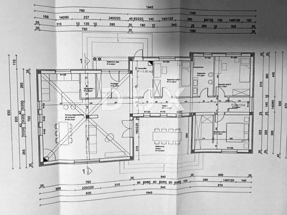 Sastoji se od otvorenog koncepta prostora koji ujedinjuje dnevni boravak, blagovaonicu i kuhinju s izlazom na natkrivenu terasu, tri spavaće sobe, kupaonice, gostinjskog toaleta i prostorije za tehniku.