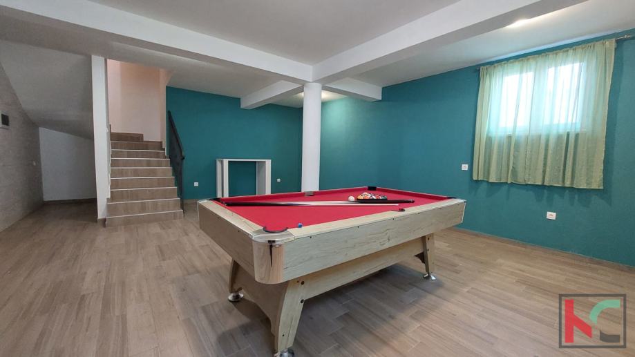 Kuća je funkcionalno raspoređena, te se u prizemlju nalazi hodnik sa stubištem, spavaća soba sa vlastitom kupaonicom, zajednička kupaonica i prostrani open space prostor sačinjen od kuhinje, blagovaonice te dnevnog boravka sa izlazom na veliku terasu koja ima otvoren prolaz prema dvorištu plaži bazena. Na katu se nalaze dvije master spavaće sobe sa vlastitim kupaonicama u "en suit" stilu sa izlazom na balkon. Podrum kuće je pretvoren u “play room” sa biljarskim stolom i mogućnošću dodatnog opremanja prema željama budućih kupaca, što čini ovu prostoriju idealnim mjestom za zabavu, druženje ili opuštanje.