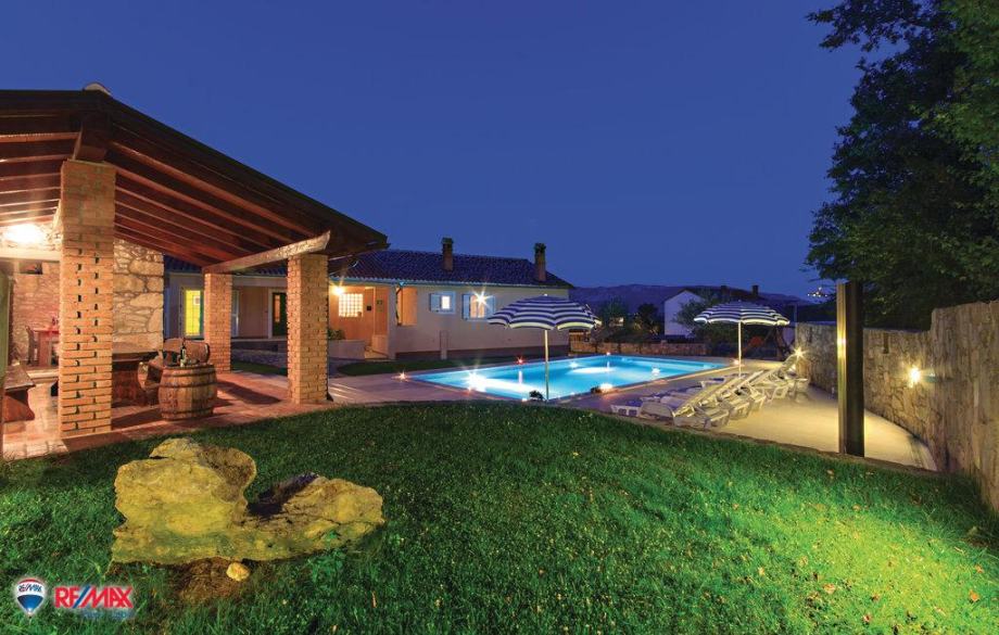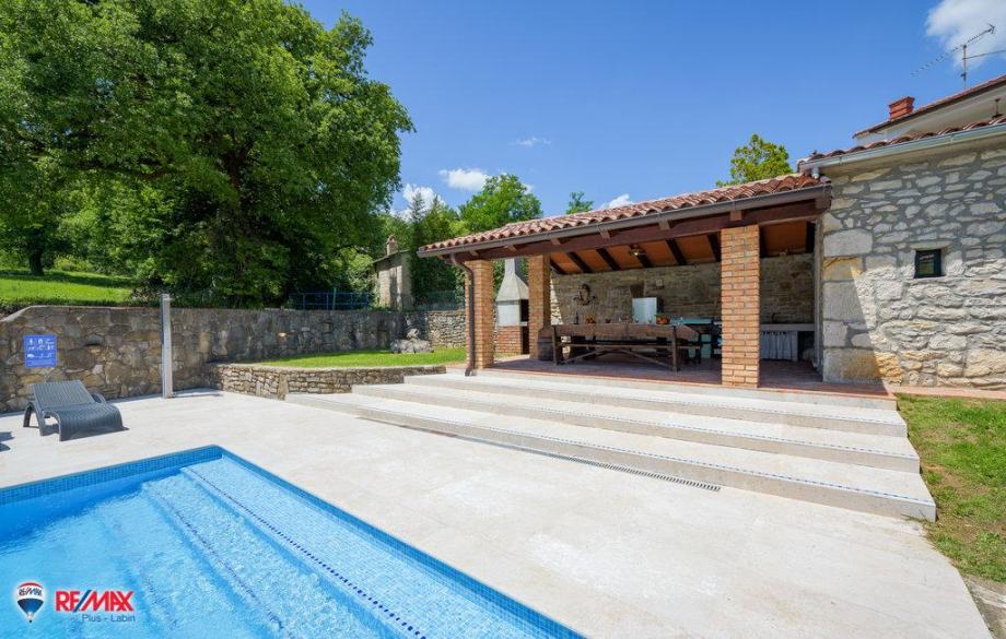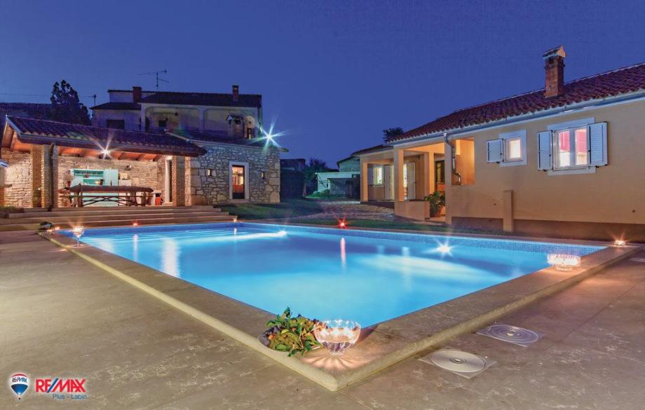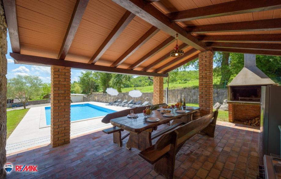 Iz oba dnevna boravka pristupa se terasi gdje se smjestio lijepi veliki vanjski bazen površine 50m2 a pored bazena je ljetna kuhinja sa roštiljem.