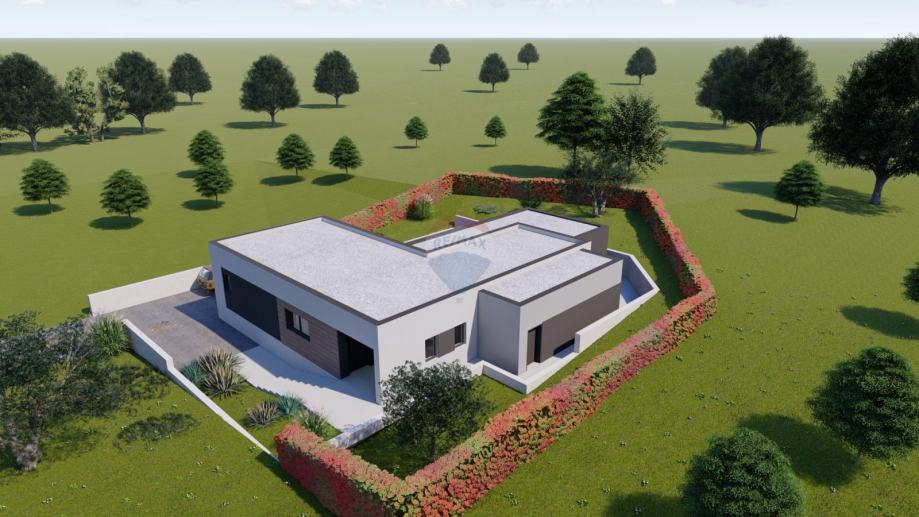 U ponudi imamo modernu Kuću koja je udaljena 12 km od mora, sastoji se od natkrivenog ulaza, hodnika, prostranog dnevnog boravka s kuhinjom i blagovaonicom, dvije spavaće sobe s vlastitim kupaonicama, toaleta, ostave i vešeraja. Dnevni dio i spavaće sobe imaju izlaz na prostranu natkrivenu terasu s ljetnom kuhinjom i prema bazenu.