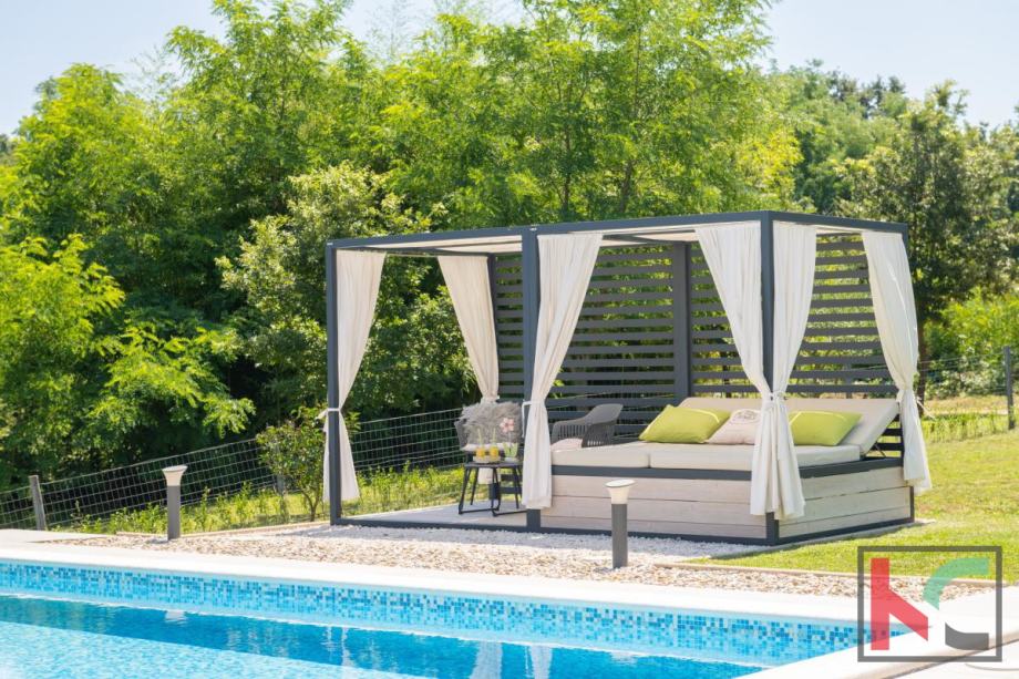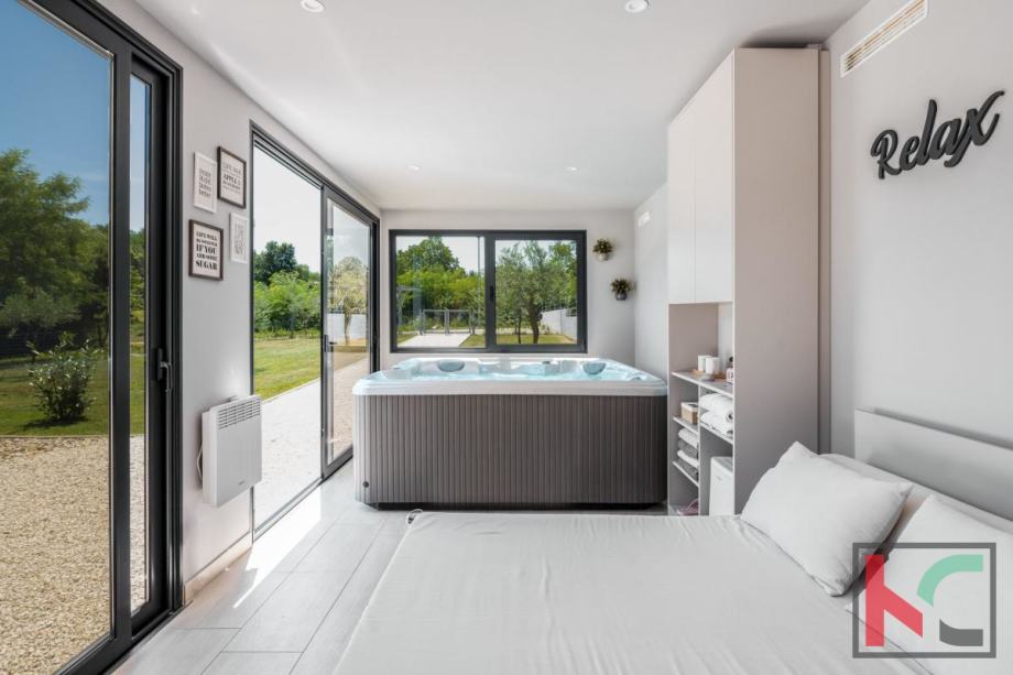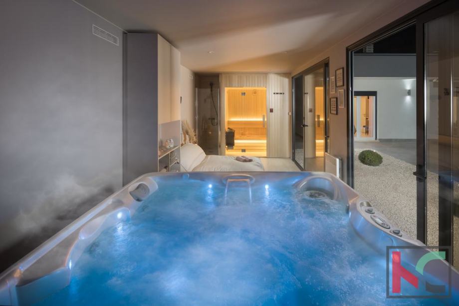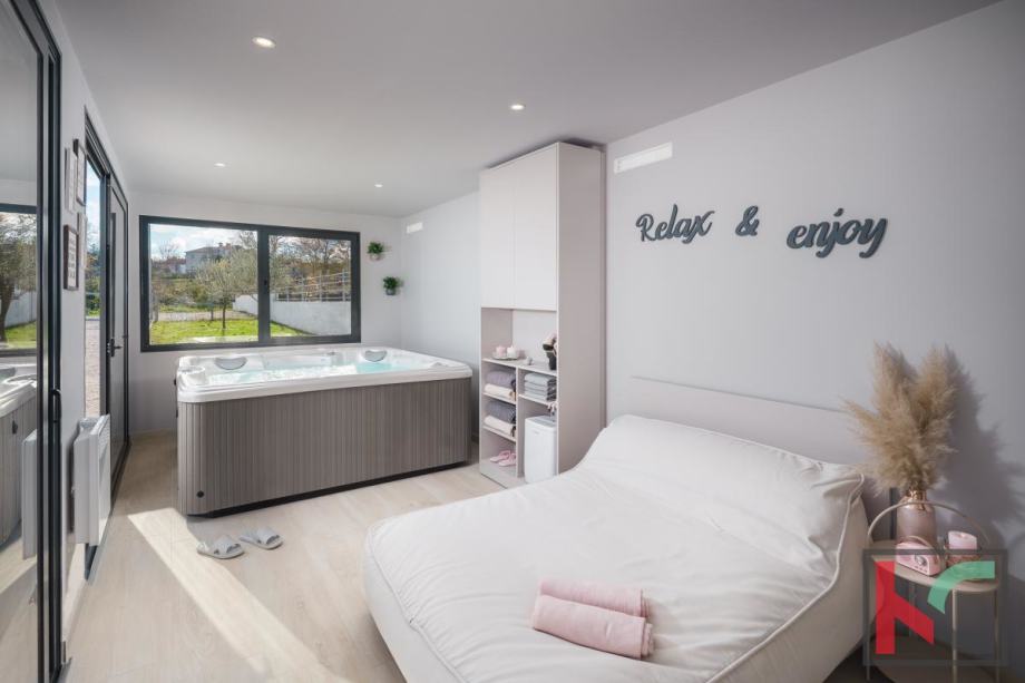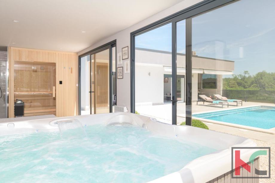 Na prekrasno uređenoj i potpuno ograđenoj okućnici od 1000 m2 nalazimo grijani hidromasažni bazen od 32 m2, wellness zonu sa finskom saunom i jacuzzijem, ljetnu kuhinju sa roštiljem i gazebo vrtnu garnituru sa ležajem.