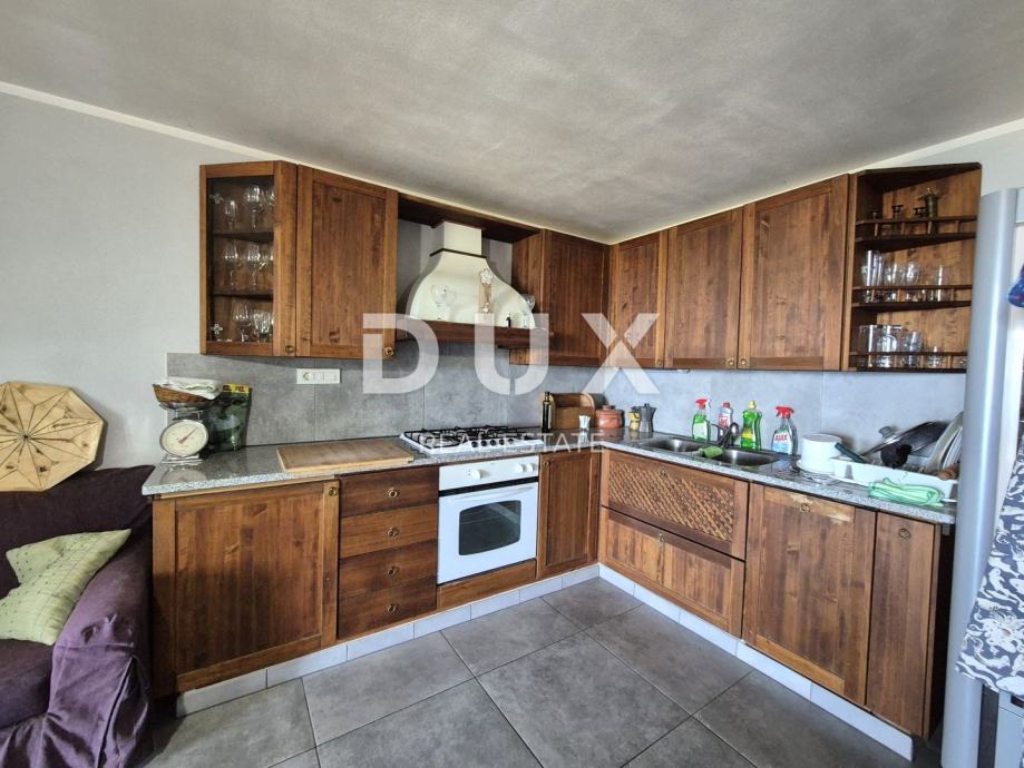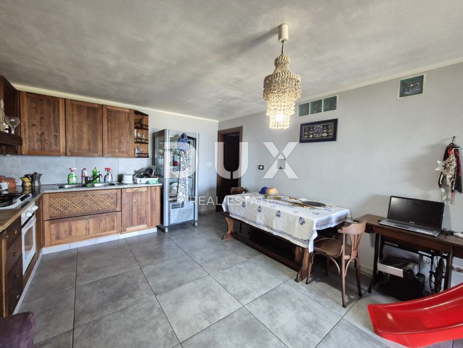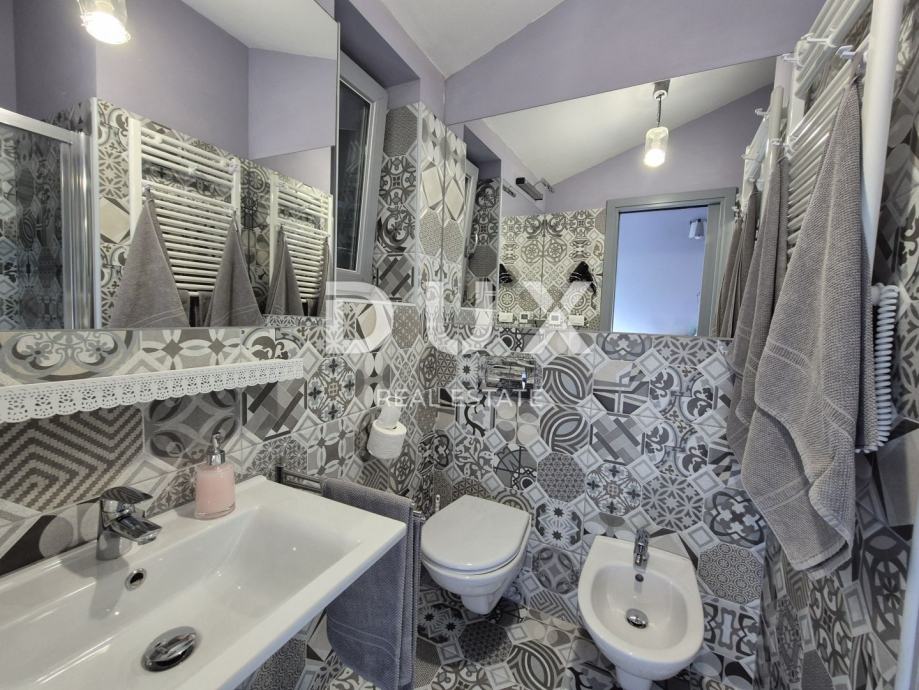 Glavni stan proteže se kroz prizemlje i kat, a sadrži prostrani dnevni boravak s velikim staklenim stijenama koje vode na veliku terasu s čarobnim pogledom na more. Dnevni je boravak povezan je s kuhinjom i blagovaonicom, a na istoj etaži nalaze se i radna soba koja se može prenamjeniti u spavaću sobu te elegantna kupaonica. Unutarnje stepenice vode na gornju etažu s tri spavaće sobe i zajedničkom kupaonicom, stvarajući intiman i topao obiteljski prostor.