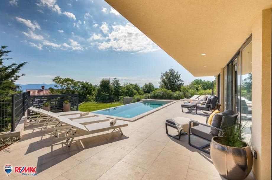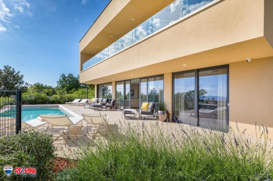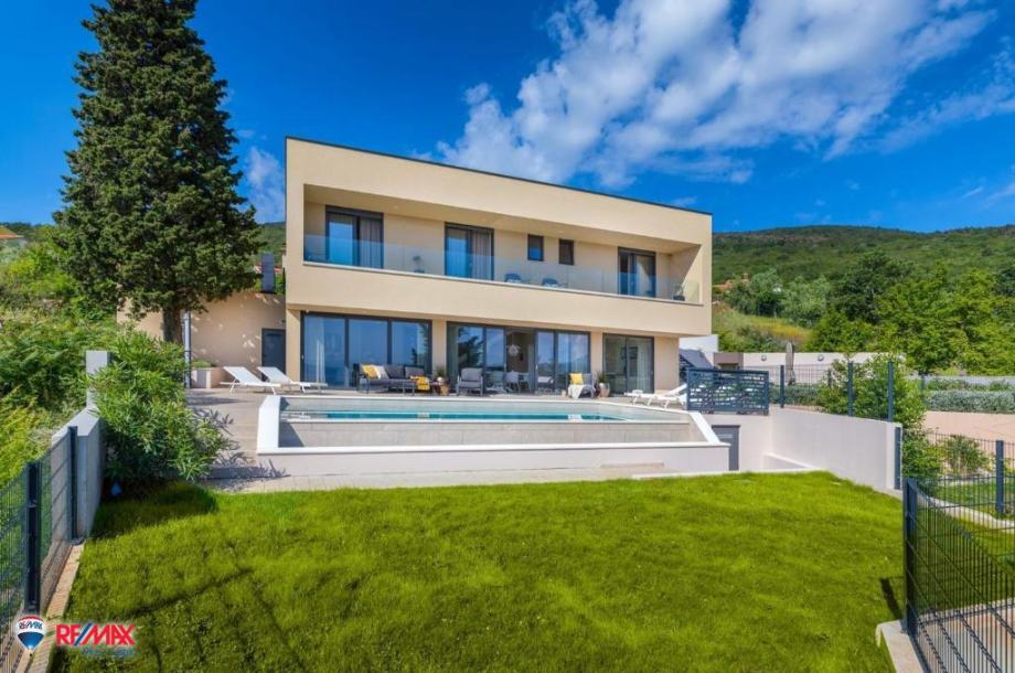 Kuća je to od 200 m2 stambenog prostora koju sačinjava savršen spoj modernih i prirodnih materijala, smještenih na idealnoj lokaciji od kuda se proteže pogled na more, Kvarner, otočje Cres, Lošinj i Rijeku. Pogled je to koji oduzima dah, pa su ga arhitekti vješto uokvirili u staklenu stijenu koja se nalazi na pročelju kuće i proteže na obje etaže.