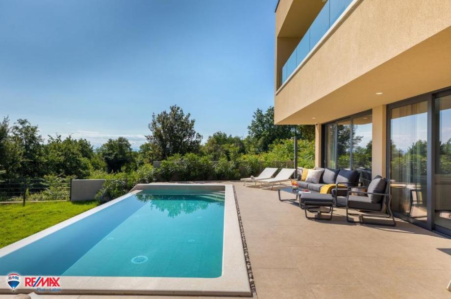 Ova impozantna vila s bazenom nalazi se u malom, idiličnom mjestu istočne Istre u zagrljaju zelenila istarske makije i šume koja se u nastavku sljubljuje s morem.