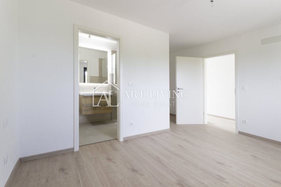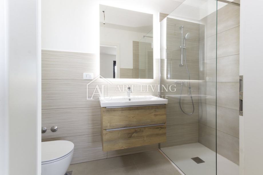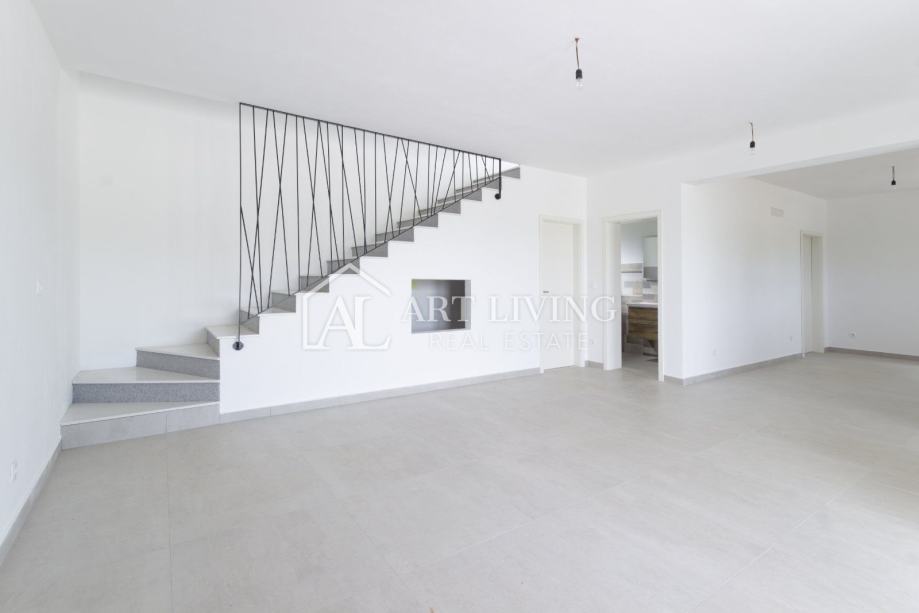 Unutarnje stepenište vodi nas na 1. kat ukupne netto površine 72,60 m2, gdje su smještene 3 spavaće sobe, svaka sa vlastitom kupaonom te prostrana terasa ukupne površine 12,77 m2 sa koje se pruža lijepi pogled na stari grad Labin