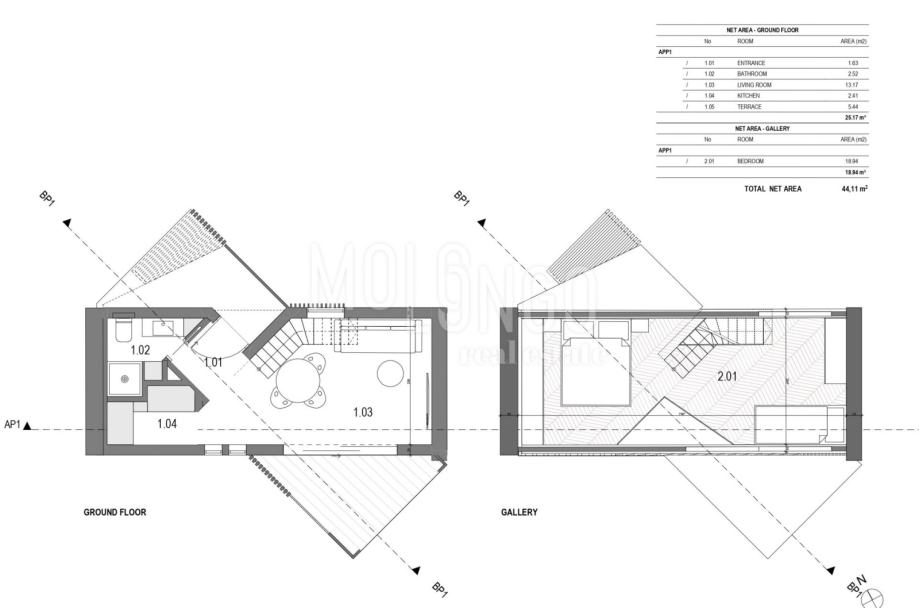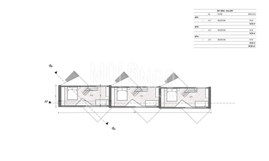 Ukupna površina ovog zemljišta iznosi 505 m2, s površinom svakog apartmana od približno 45 m2. Svaki apartman ima prizemlje s kuhinjom, dnevnim boravkom i kupaonicom, dok se spavaći dio nalazi na galeriji. Svi potrebni priključci su već dostupni, uključujući vodu, struju i septičku jamu.