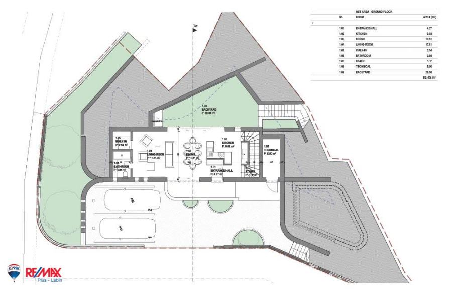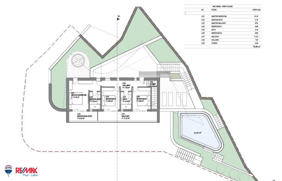 Planirana je kuća površine 210 m2 koja bi se sastojala od podruma, prizemlja i kata. Zemljište je površine 435 m2 a na njemu je još planiran bazen i tri parkirna mjesta.
