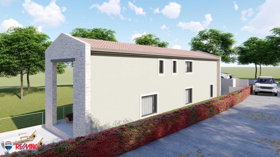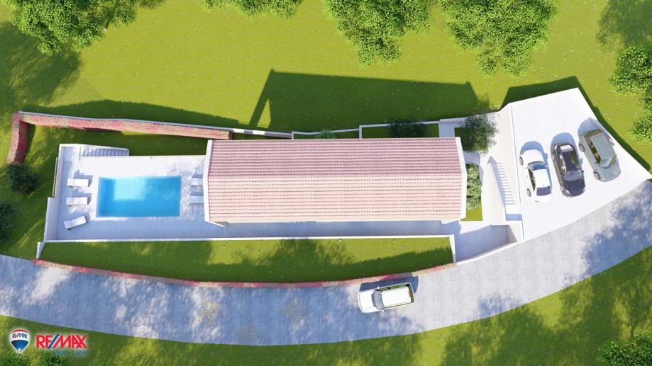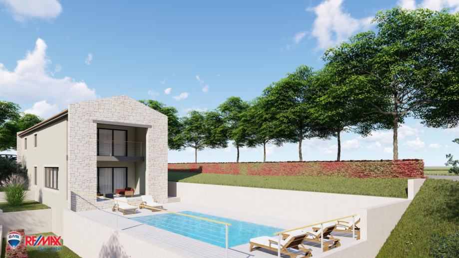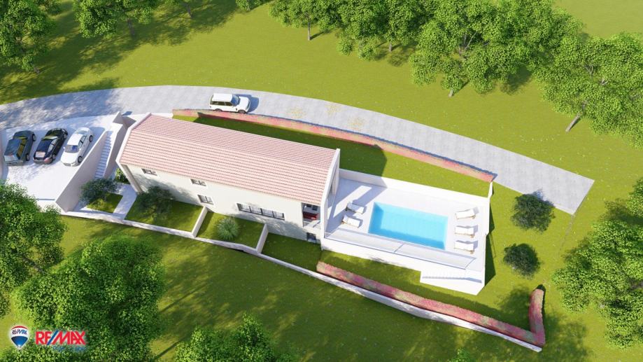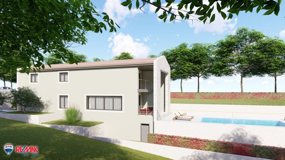 Prizemlje: dnevni prostor s kuhinjom, blagovaonicom i dnevnim boravkom s izlazom na natkrivenu terasu, sunčalište i bazen; dodatno su planirani vešeraj i toalet