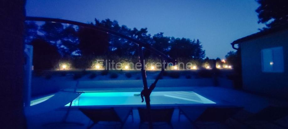 Bazen je površine 42m2 ispunjen slanom vodom. Rub bazena popločan je kamenom, a sunčalište oko bazena opremljeno ležaljkama. Uz bazen je i grill zona sa otvorenim kaminom za roštiljanje.