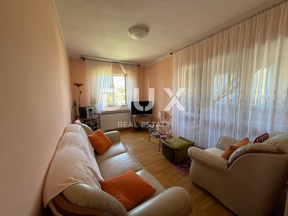 Prostran stan (140 m²) u novijem dijelu kuće, koji odiše svjetlošću i prostranošću sastoji se od ulaznog hodnika, dnevnog boravka, kuhinje, tri udobne spavaće sobe, kupaonice, dodatnim WC-om i ostavom, što osigurava maksimalnu praktičnost. Posebna prednost je prostrana terasa s koje se pruža pogled na zelenilo i okolicu.