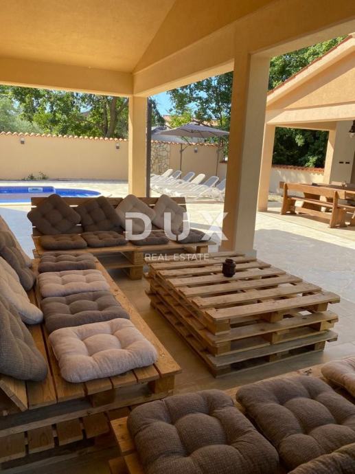 Okućnica je u potpunosti ograđena i uređena, a prostire se na 846 m². Na raspolaganju je više parkirnih mjesta, dječje igralište, sunčalište, vrtna kućica koja može služiti kao spremište, te bazen dimenzija 7x4 metra s rimskim ulazom. Dodatnu vrijednost ovoj nekretnini daju automatski sustav navodnjavanja, vanjska rasvjeta te alarmni sustav. Kuća se prodaje potpuno namještena, a sav namještaj izrađen je po mjeri, što dodatno naglašava kvalitetu i pažnju posvećenu detaljima. Grijanje i hlađenje omogućeno je putem klima uređaja.