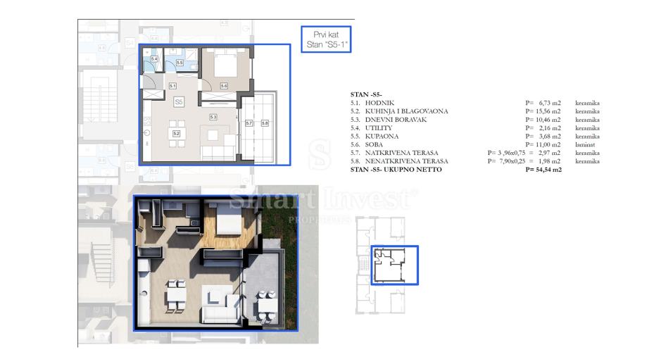 • ukupna neto površina stana (s koeficijentima): 54,54 m2