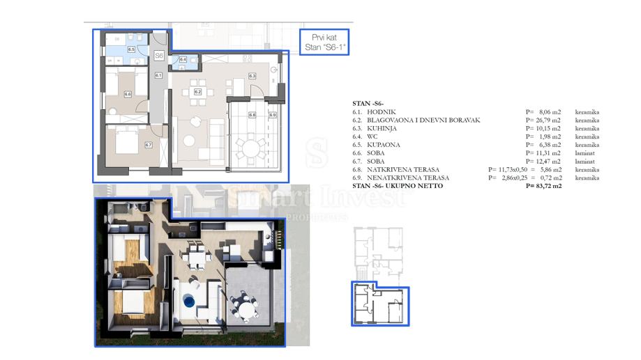 • ukupna neto površina stana (s koeficijentima): 83,72 m2
