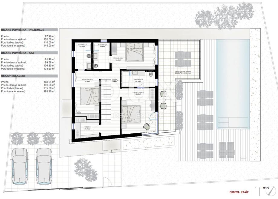 Moderan interijer u kojem se prožimaju blage i svijetle zemljane boje s elegantnom crnom, podijeljen je na dvije etaže sveukupne netto površine od 191,58 m² te odiše elegancijom i jednostavnošću te pruža visoku razinu komfora.