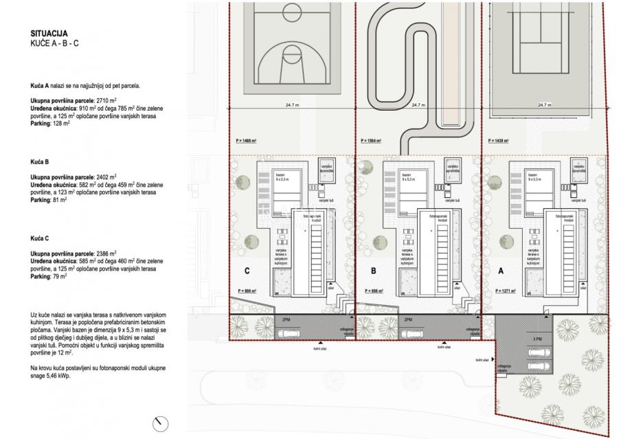 Parking je ukupne kvadrature 128 m2. Stambena površina iznosi 176 m2.