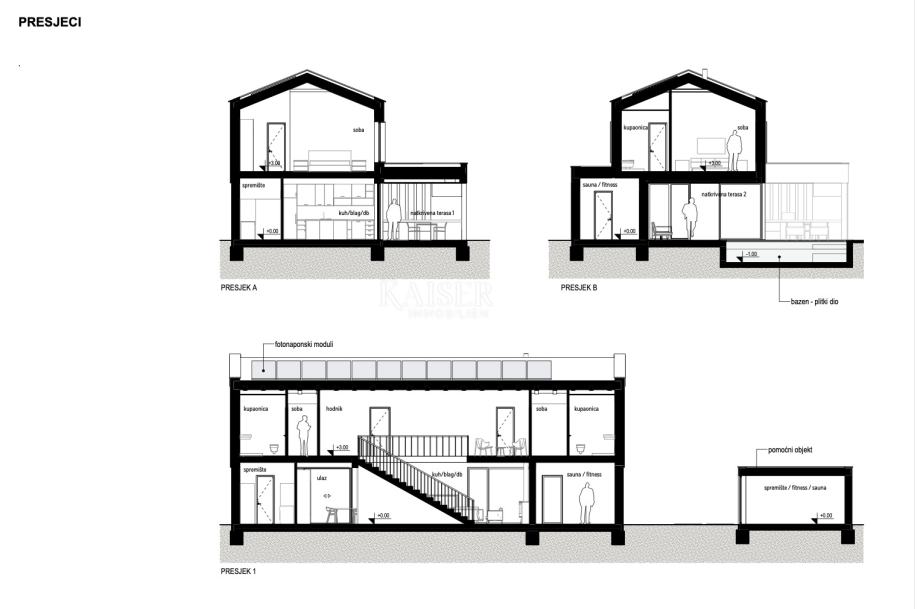 Na ovoj etaži također se nalazi i spremište (unutarnje i vanjsko), prostorija za saunu/fitness te prijelaz na natkrivenu terasu sa ljetnom kuhinjom te grijanim bazenom u produžetku sa masažnim dijelom ukupne površine 48 m2.