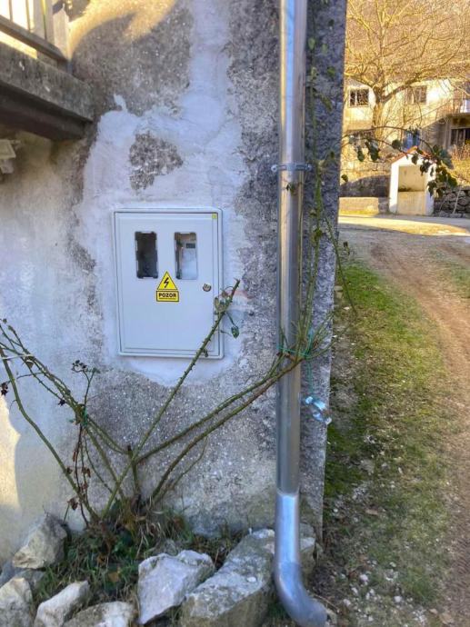 Priključak struje je napravljen,priključak vode se nalazi na 3 m udaljenosti te bi ga novi vlasnik trebao izvesti o svom trošku
