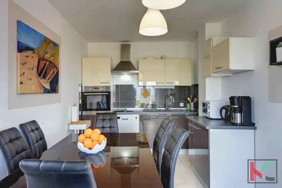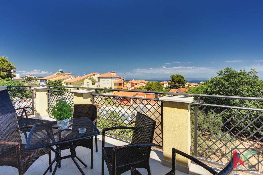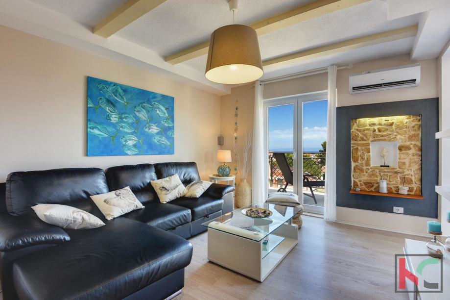 Stan je ugodan za boravak, opremljen kvalitetnim namještajem i velikim balkonom sa kojeg se pruža lijep pogled na more.