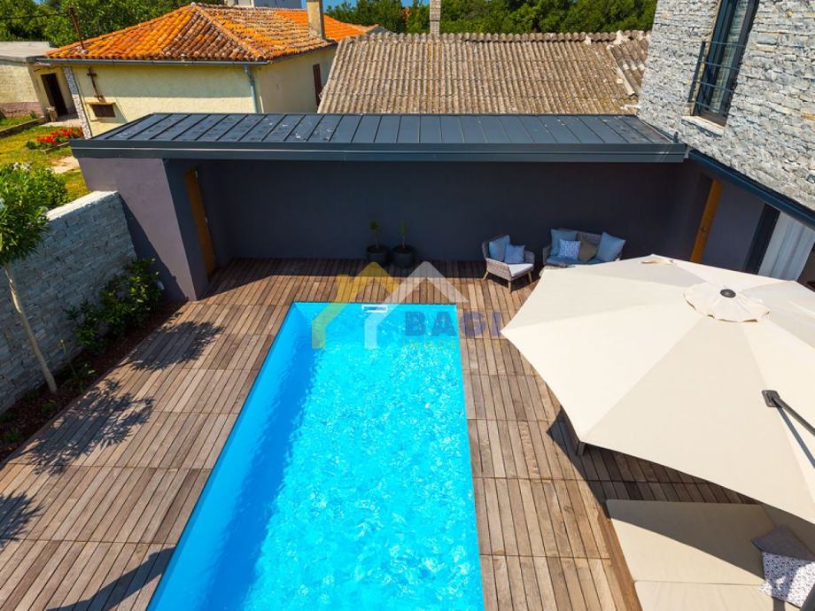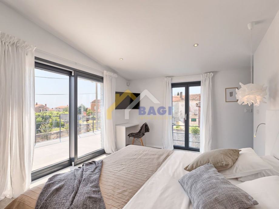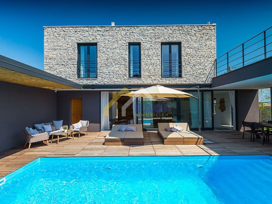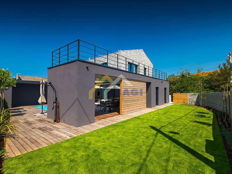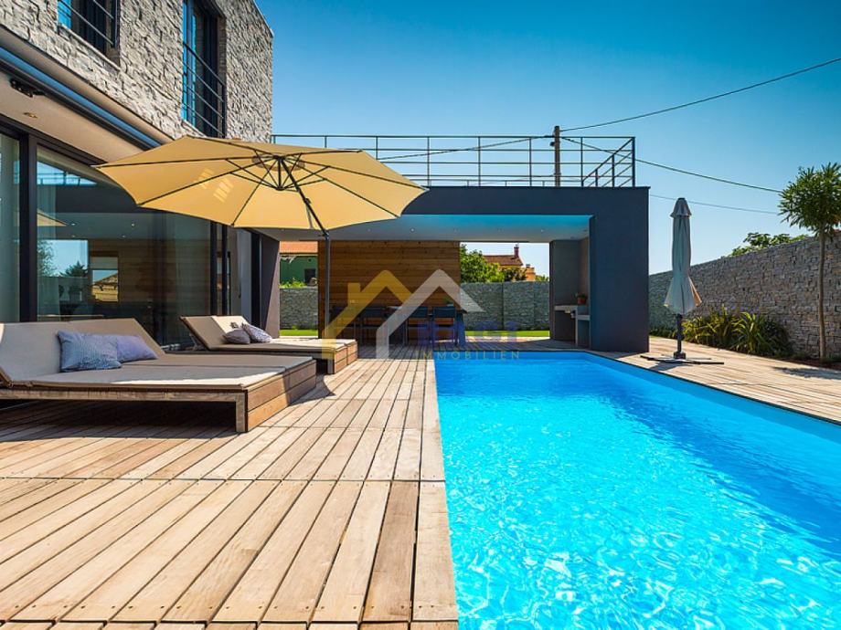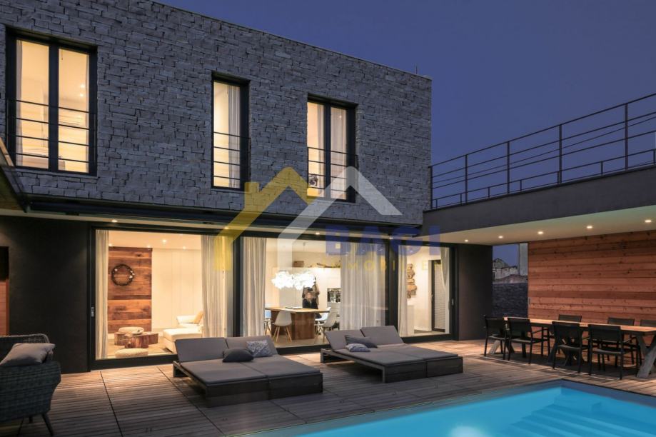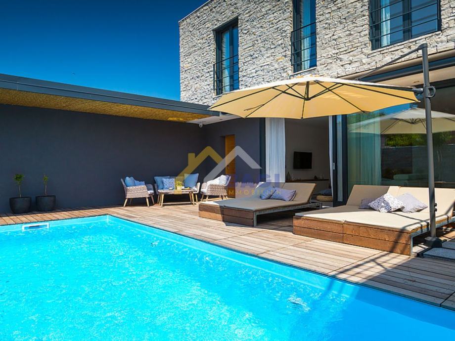 Ova lijepa, moderna vila nudi cca 250 m2 korisnog prostora koji se prostire preko podruma, prizemlja i prvog kata. U podrumu se nalazi strojarnica, i spremište koje se može koristiti kao vinski podrum, konoba ili prostor za društvene igre, a moguće je instalirati i saunu. U prizemlju se nalazi prostran dnevni boravak sa kuhinjom i blagovaonicom, odvojeni toalet i praonica, a na katu se nalaze 2 velike (en suite) spavaće sobe svaka sa svojom kupaonicom kao prostrana terasa od cca 43 m2. Iz prostranog dnevnog boravka koji je otvorenog plana zajedno s kuhinjom i blagovaonicom, se kroz visoke staklene stijene izlazi na lijepo uređenu okućnicu sa bazenom. Bazen (21,64m2), ljetnom kuhinjom, zidanim vanjskim grillom i al fresco stolom i stolicama. Sve etaže se mogu povezati unutarnjim dizalom za koji je izgrađen prostor (potrebno instalirati samo dizalo). Ova vila je kvalitetno građena i opremljena s vrhunskim komponentama , prvoklasnom keramikom i sanitarijama a sve sa osobitom pozornošću na detalje. Tu je i video nadzor, alarm, priprema za centralni kamin, priprema za solarne panele itd. Mirno okruženje.