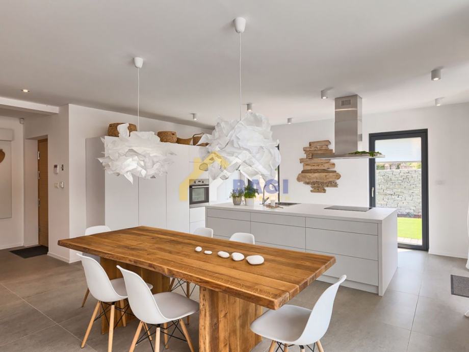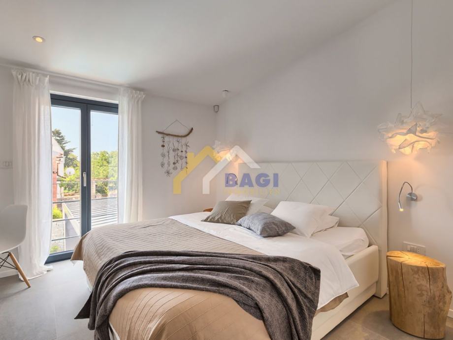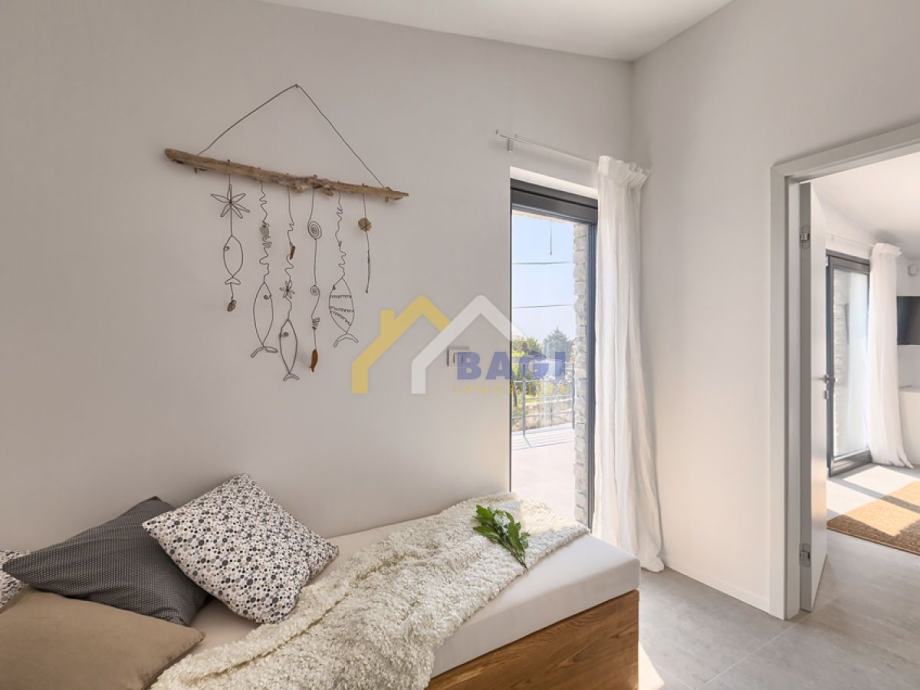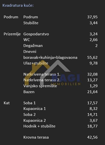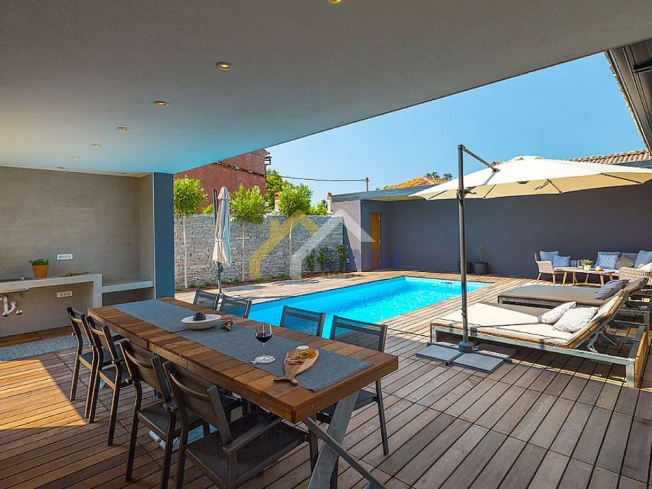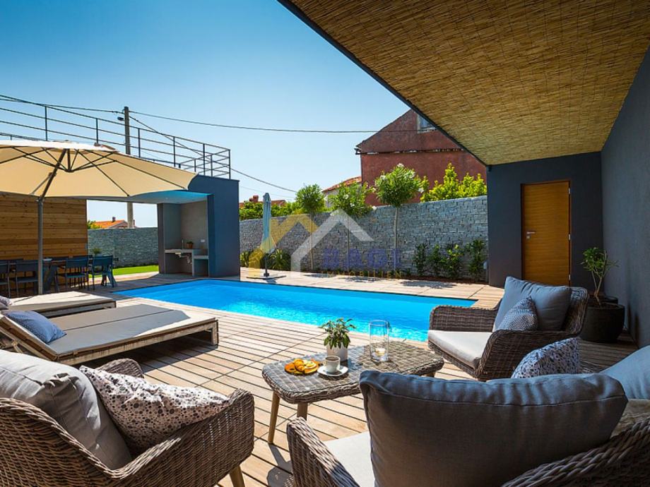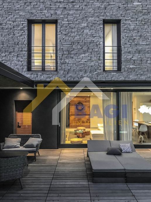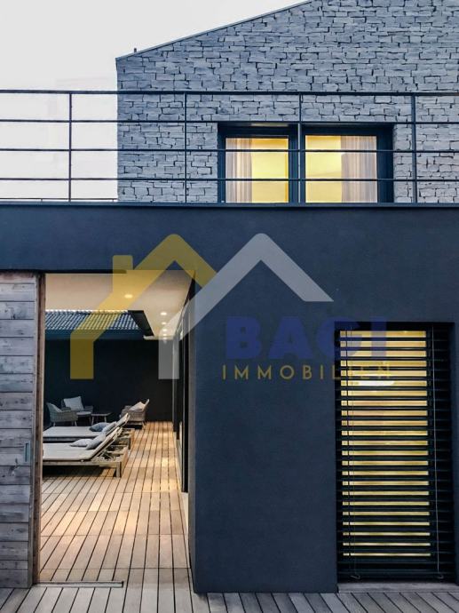 Ova lijepa, moderna vila nudi cca 250 m2 korisnog prostora koji se prostire preko podruma, prizemlja i prvog kata. U podrumu se nalazi strojarnica, i spremište koje se može koristiti kao vinski podrum, konoba ili prostor za društvene igre, a moguće je instalirati i saunu. U prizemlju se nalazi prostran dnevni boravak sa kuhinjom i blagovaonicom, odvojeni toalet i praonica, a na katu se nalaze 2 velike (en suite) spavaće sobe svaka sa svojom kupaonicom kao prostrana terasa od cca 43 m2. Iz prostranog dnevnog boravka koji je otvorenog plana zajedno s kuhinjom i blagovaonicom, se kroz visoke staklene stijene izlazi na lijepo uređenu okućnicu sa bazenom. Bazen (21,64m2), ljetnom kuhinjom, zidanim vanjskim grillom i al fresco stolom i stolicama. Sve etaže se mogu povezati unutarnjim dizalom za koji je izgrađen prostor (potrebno instalirati samo dizalo). Ova vila je kvalitetno građena i opremljena s vrhunskim komponentama , prvoklasnom keramikom i sanitarijama a sve sa osobitom pozornošću na detalje. Tu je i video nadzor, alarm, priprema za centralni kamin, priprema za solarne panele itd. Mirno okruženje.